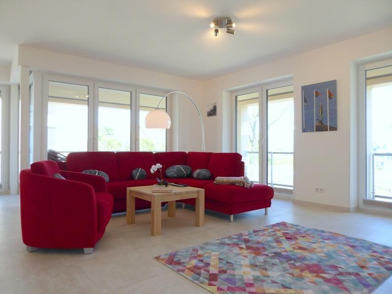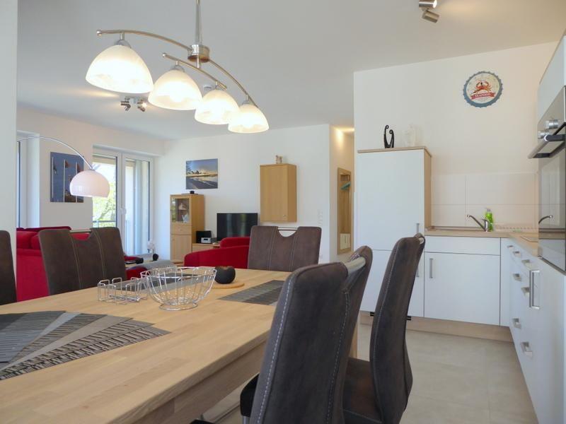Sie gelangen über die Treppe oder den Fahrstuhl in Ihr Domizil. Durch den Flur mit geschickt integrierter Garderobe geht es in den großen, sehr freundlich eingerichteten Wohn- und Essbereich mit Couch inklusive Bettfunktion. Die farbenfrohe Einrichtung mit stimmungsvollen Bildern von Dangast und Umgebung im Zusammenspiel mit hellen Holztönen machen Lust auf "Meer"! Eins ist sicher - hier können Sie sich erholen und einfach abschalten. Für die warmen und sonnigen Tage können Sie auf der großen, durchgehenden Loggia mit tollen Blick auf den Jadebusen entspannen.
