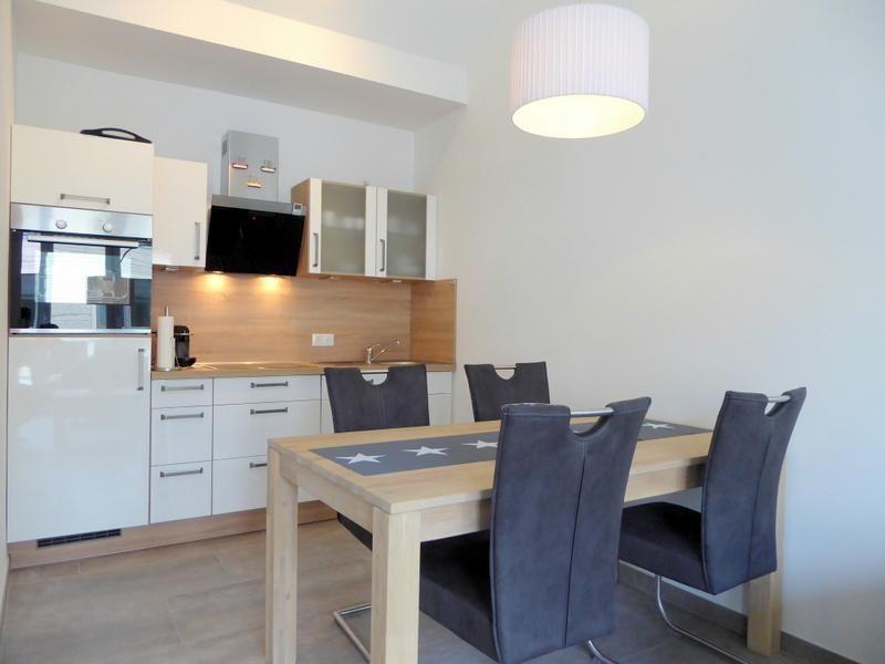 Über die Treppe oder den Aufzug gelangen Sie in Ihr Urlaubsdomizil. Durch den Flur mit moderner Garderobe geht es in den großzügig geschnittenen Wohn- und Essbereich. Der Essbereich mit Massivholzesstisch und Schwingstühlen und die gemütliche Sofaecke machen einen stimmigen Gesamteindruck. Das Ecksofa lässt sich zu einer weiteren Schlafgelegenheit für zwei weitere Personen ausziehen. Für Entertainment ist dank eines modernen Flachbildfernsehers und Wandeinbauradio gesorgt. Praktische Plisseés an den Fenstern lassen sich einfach und schnell zum Sichtschutz nach oben ziehen.