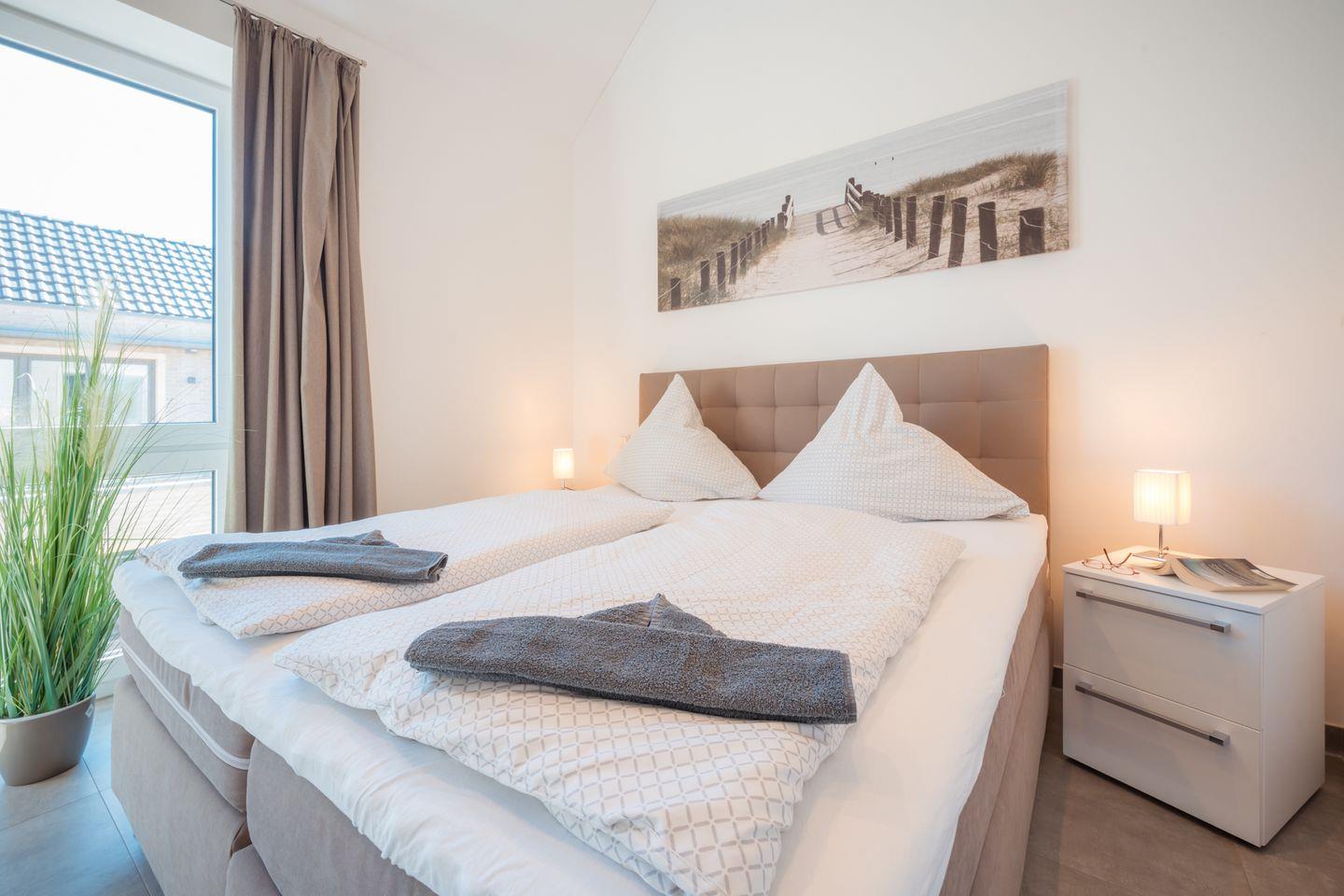 In dem Penthouse befinden sich zwei Schlafzimmer mit je einem Boxspring-Doppelbett (mit Einzelmatratzen). Extra hohe Komfortmatratzen mit zusätzlichen kuschelig-weichen Toppern sowie Fenster mit lärm- und wärmedämmender Dreifachverglasung sorgen für entspanntes Schlafen. Beide Schlafzimmer sind mit Full-HD-Flachbild-TV und Fliegengittern ausgestattet.