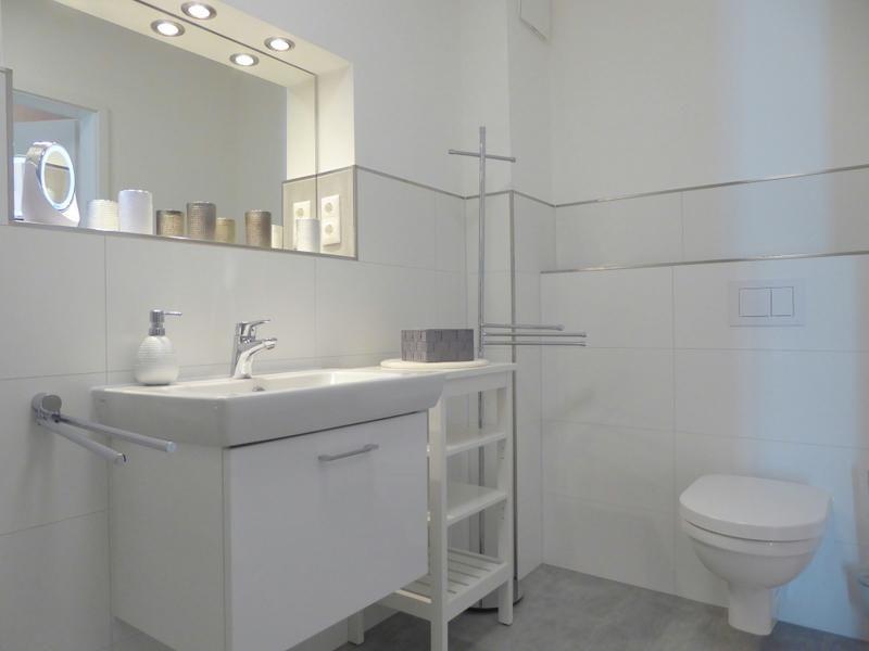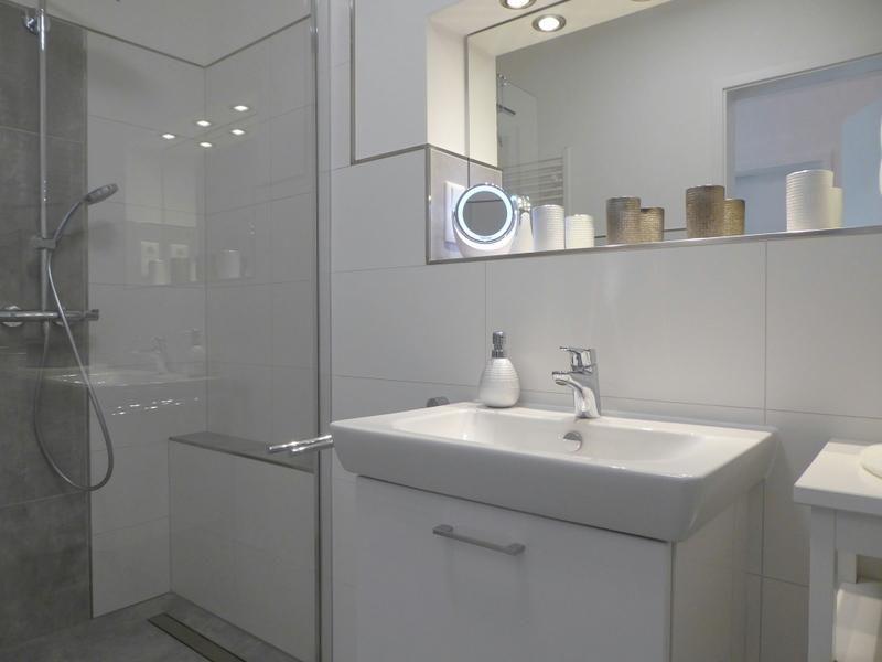 Bad und Sanitär: bodentiefe, barrierefreie Sommerregendusche, Waschtischanlage mit Spiegel, Föhn, WC, Handtuchheizungen, Handtücher auf Anfrage