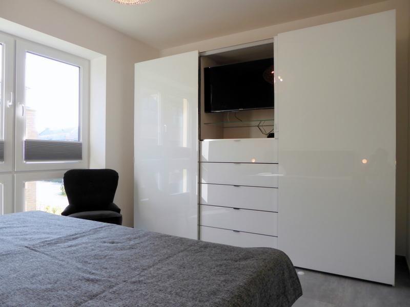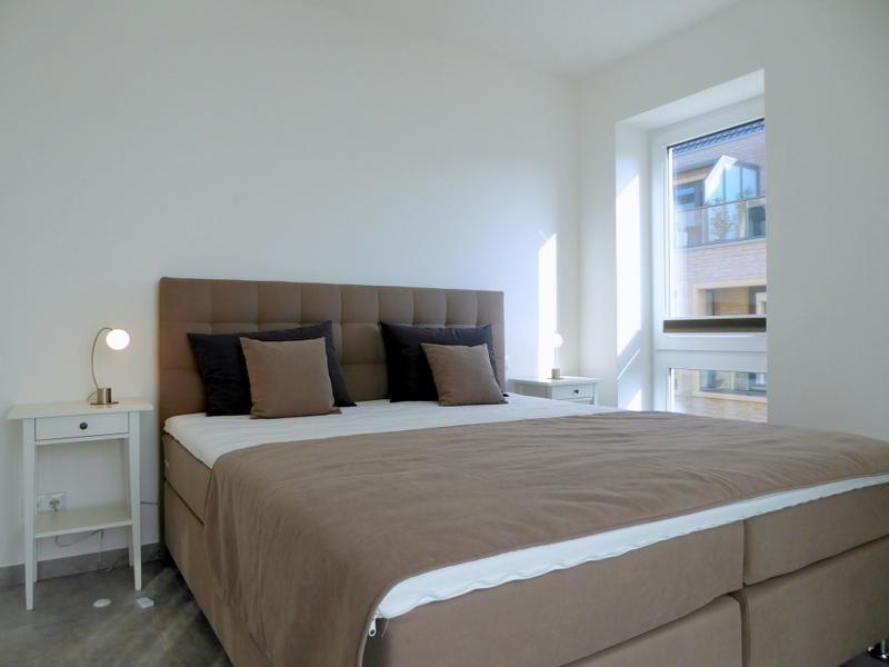 Über einen Fahrstuhl oder die Treppe gelangen Sie in Ihr Feriendomizil. Gleich rechts gehalten finden Sie das geräumige Duschbad mit begehbarer Sommerregendusche, Waschtisch und WC. Direkt gegenüber geht es in das erste Schlafzimmer mit Doppel-Boxspringbett plus großer Hochglanz-Schrankwand. Ein Flat-TV verbirgt sich raffiniert hinter der Schiebetür des Kleiderschranks. Die Fenster sind dank beschichteter Plissées schnell und einfach zu verdunkeln.