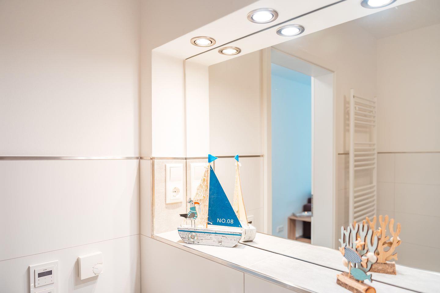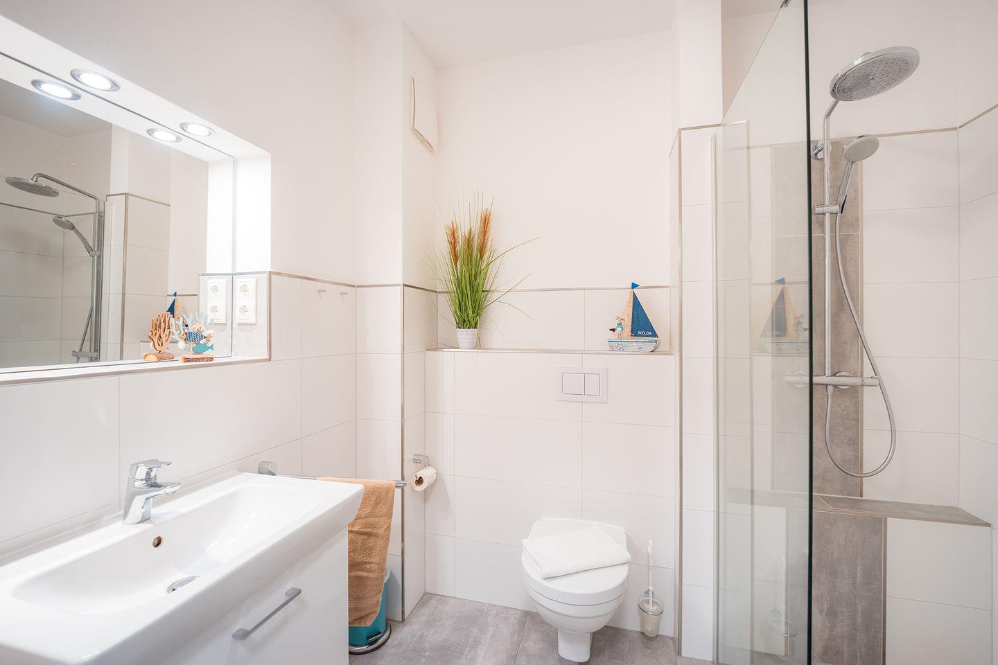 Vom Eingangsbereich geht es links in das schicke Duschbad mit WC. Die große, bodengleiche Dusche, eine Handtuchheizung sowie der beleuchtete Spiegel als Nische über dem Waschbecken bieten aller höchsten Komfort.