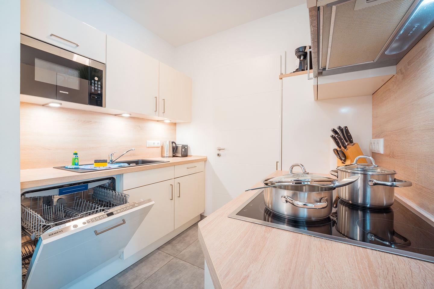 Küche: Einbauküche, Kühlschrank mit Gefrierfach, 4-Zonen Cerankochfeld, Backofen, Mikrowelle, Dunstabzugshaube, Geschirrspüler, Kaffeefiltermaschine, Tassimo, Toaster, Wasserkocher, hochwertiges Geschirr und Besteck