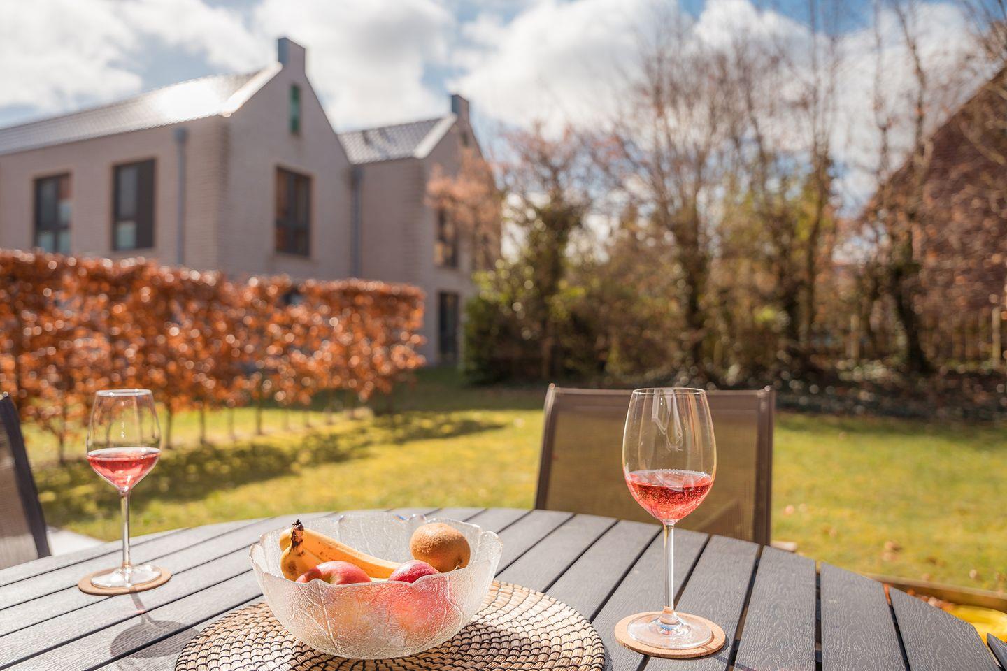 Alle Wände zum Garten bestehen aus großen, bodentiefen Glaselementen (zusammen ca. 20 m² Glasfläche) und lassen viel Licht nach innen. Elegante Vorhänge sorgen bei Bedarf für den nötigen Sichtschutz. Für Entertainment ist dank Flat-TV und HiFi-Anlage bestens gesorgt. Der Essbereich mit topmoderner Küche ist mit besten Markengeräten ausgestattet. Vom sehr geschmackvoll eingerichteten Wohn-Essbereich gelangen Sie auf die überdachte Westterrasse mit Gartenmöbeln und einer anschließenden Rasenfläche, welche durch Heckenpflanzen und Baumbestand lauschig eingefriedet ist.
