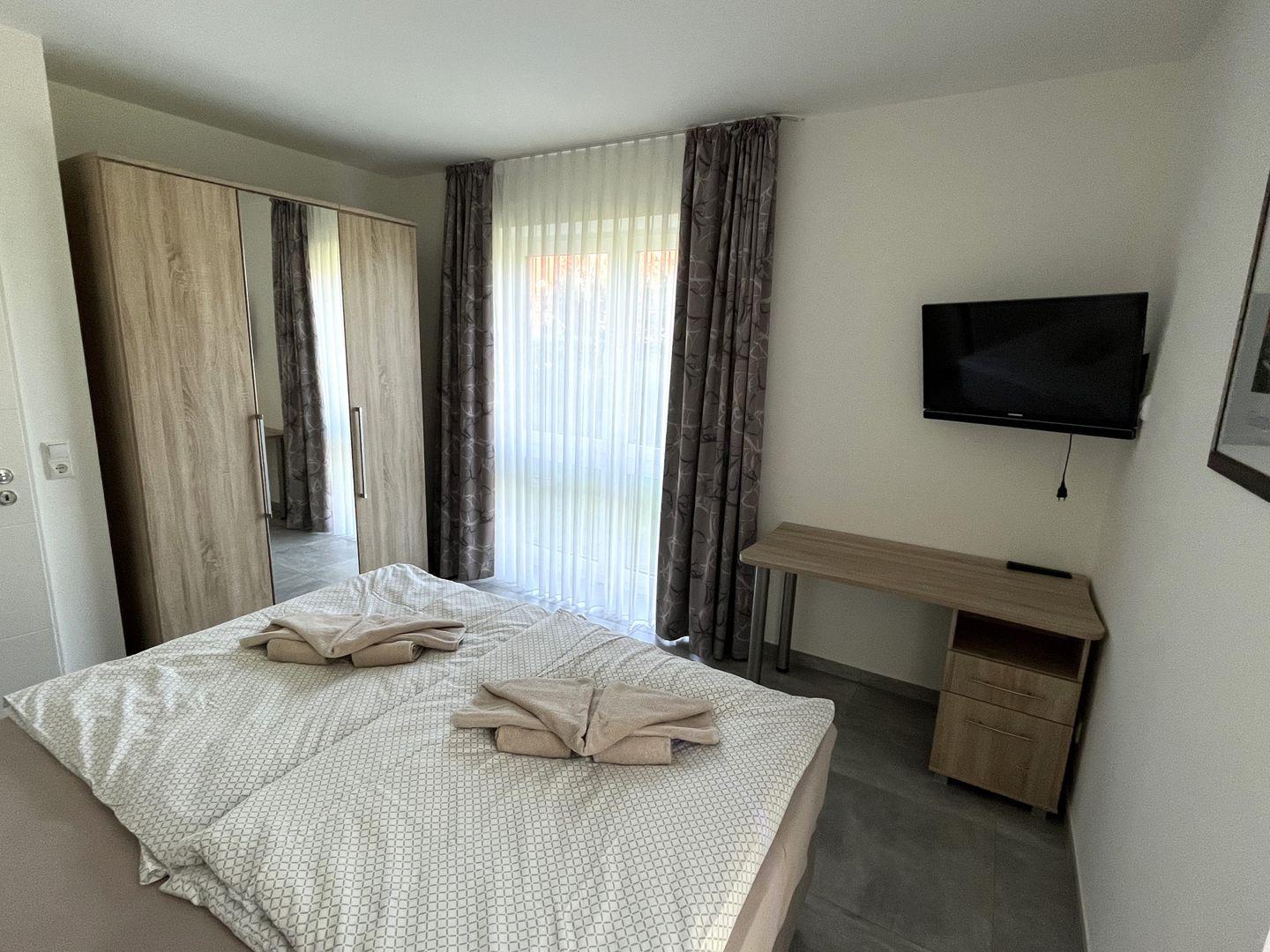 Eine Tür weiter vom Flur geht es in das zweite Schlafzimmer mit Doppelbett und einem zusätzlichen Schreibtisch. Auch hier verfügen Sie über viel Stauraum dank einer großen Schrankwand. Die Vorhänge sorgen auch hier für eine schnelle und einfache Verdunklung. Ein Flat-TV an der Wand rundet auch hier das Angebot ab.