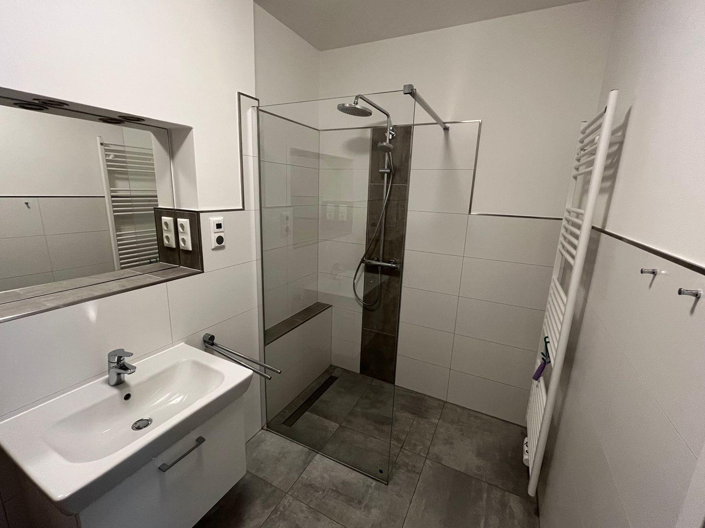 Bad und Sanitär: bodentiefe, barrierefreie Sommerregendusche, Waschtischanlage mit Spiegel, Föhn, WC, Handtuchheizungen, Handtücher auf Anfrage