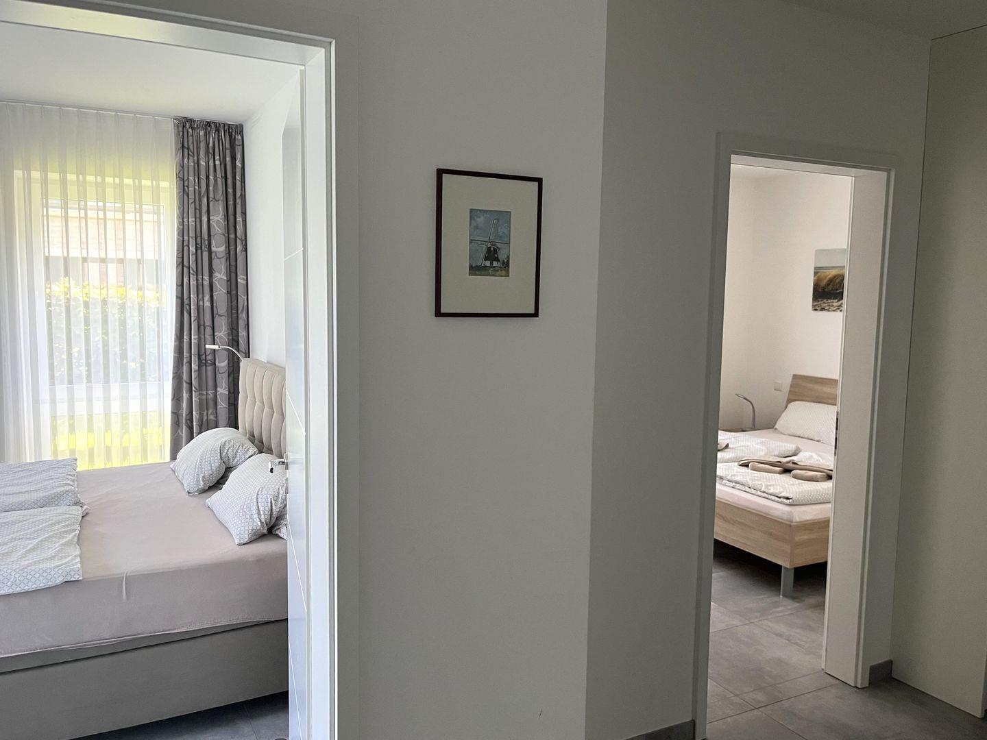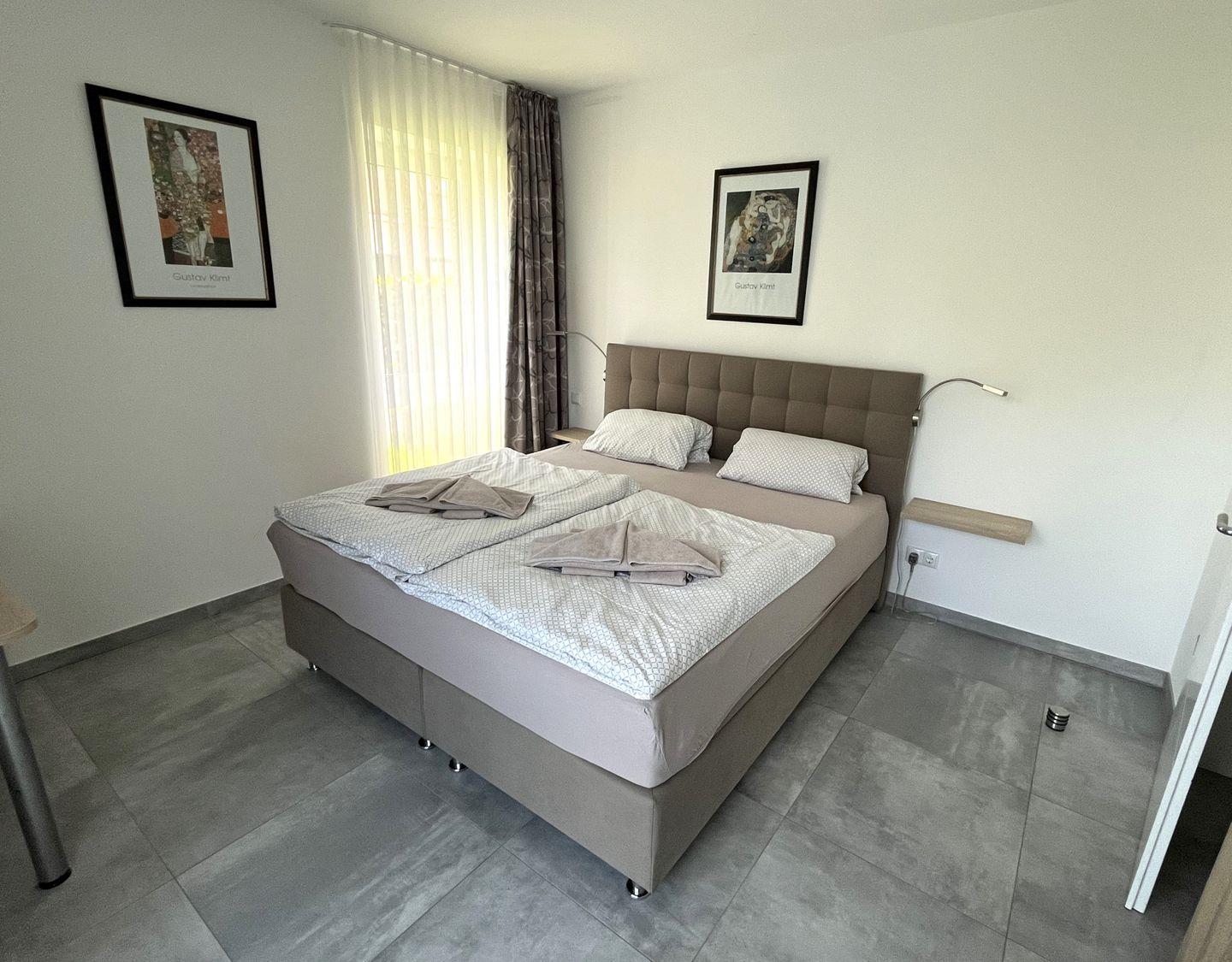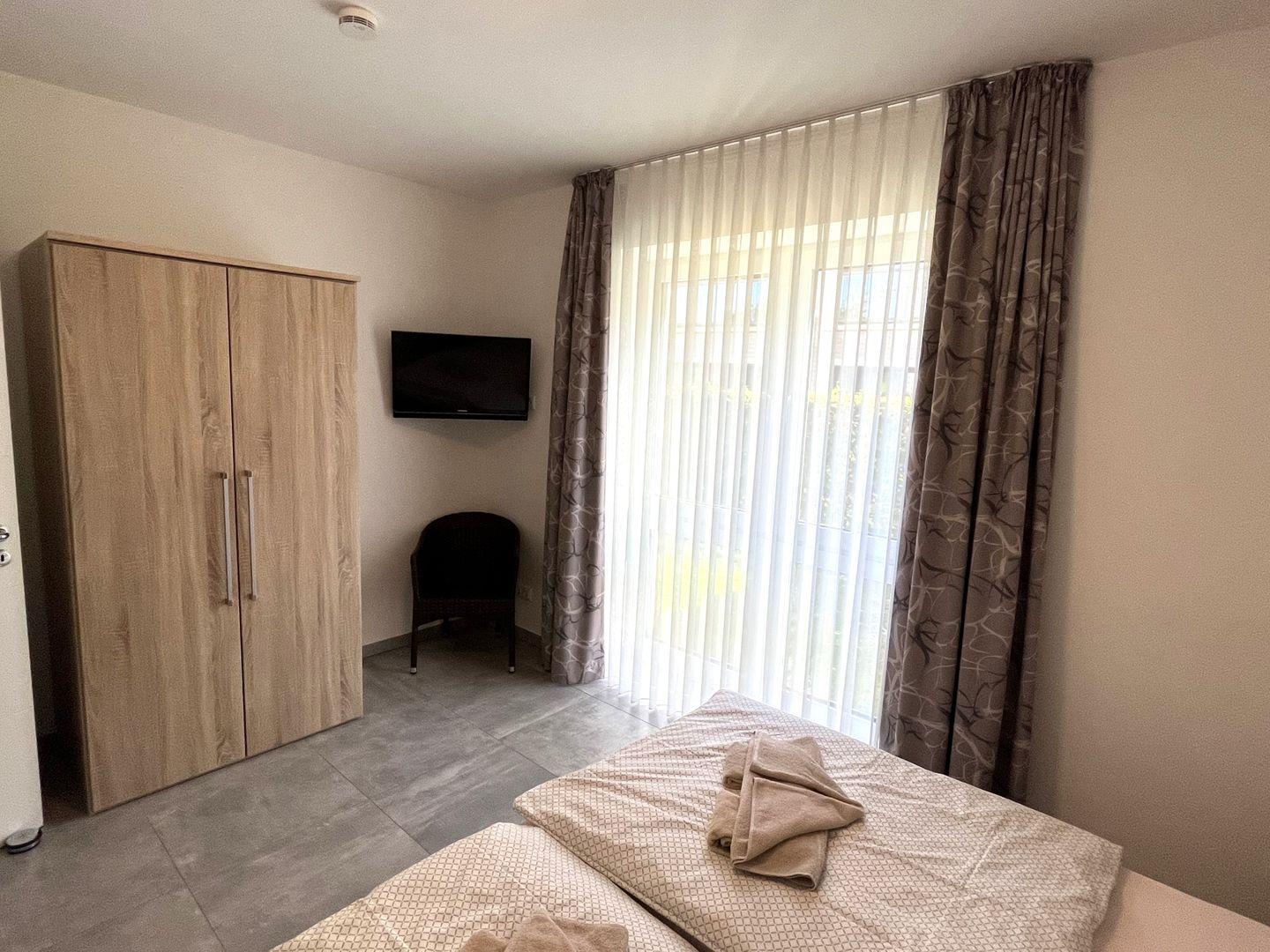 Schlafzimmer: 2 x Doppelbett (Maße: 180 x 200 cm), 2x Flat-TV, Leselampen, Kleiderschrank, Schreibtisch, Bettwäsche auf Anfrage