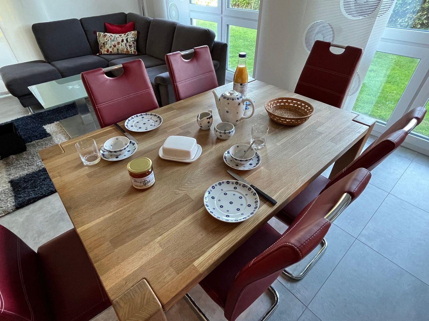 Esszimmer: großer massiver Tisch mit 4 bequemen Stühlen, 2 weitere optional bei Besuch in den Schlafzimmern,
