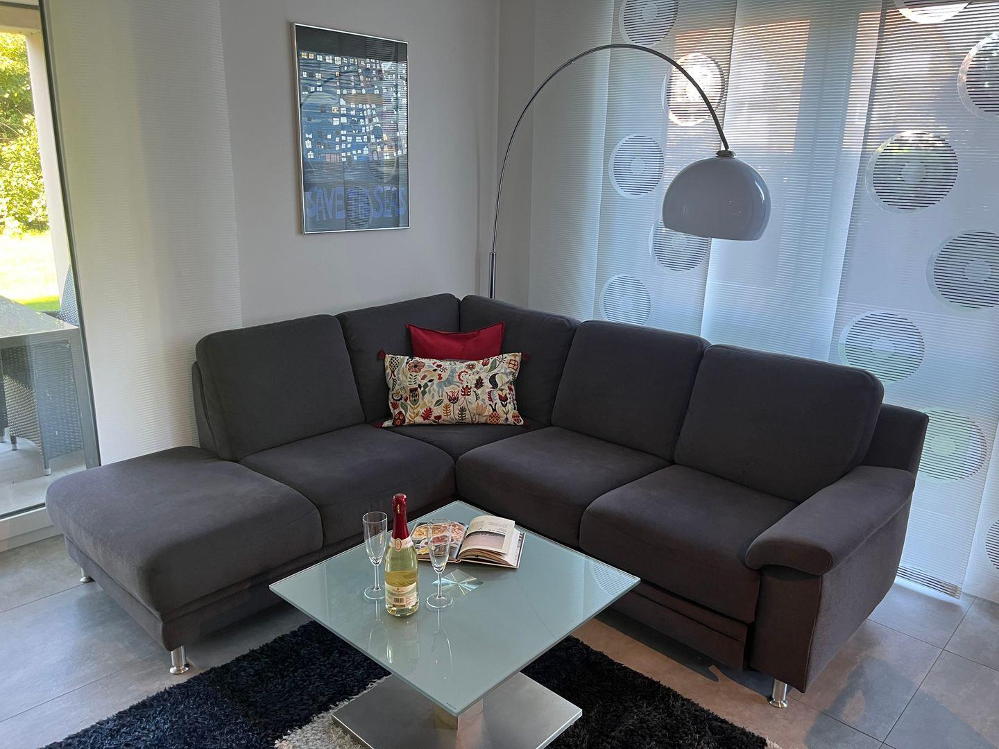 Wohnzimmer: gemütliche Sitzecke mit Sessel, Sofa, Leselampe, Flachbildfernseher, Empfang deutschsprachiger TV-Programme (SAT-Anlage)