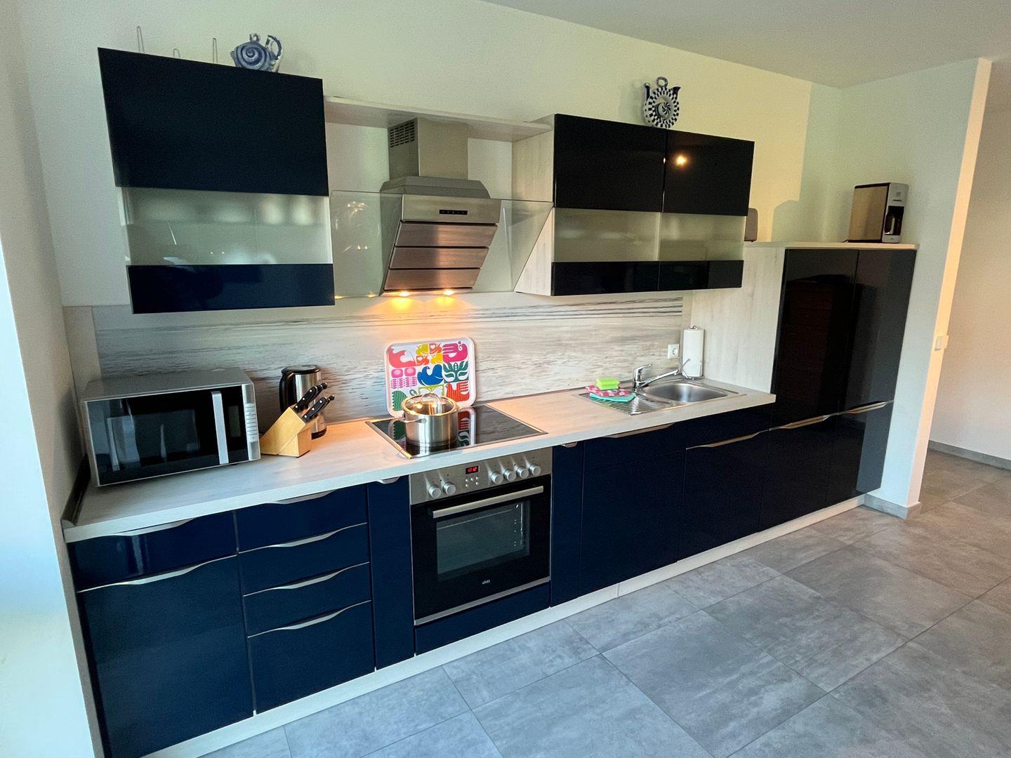Küche und Haushalt: Einbauküche, Kühlschrank mit Gefrierfach, 4-Zonen Cerankochfeld, Backofen, Mikrowelle, Dunstabzugshaube, Geschirrspüler, Toaster, Wasserkocher, Kaffeefiltermaschine, hochwertiges Geschirr und Besteck