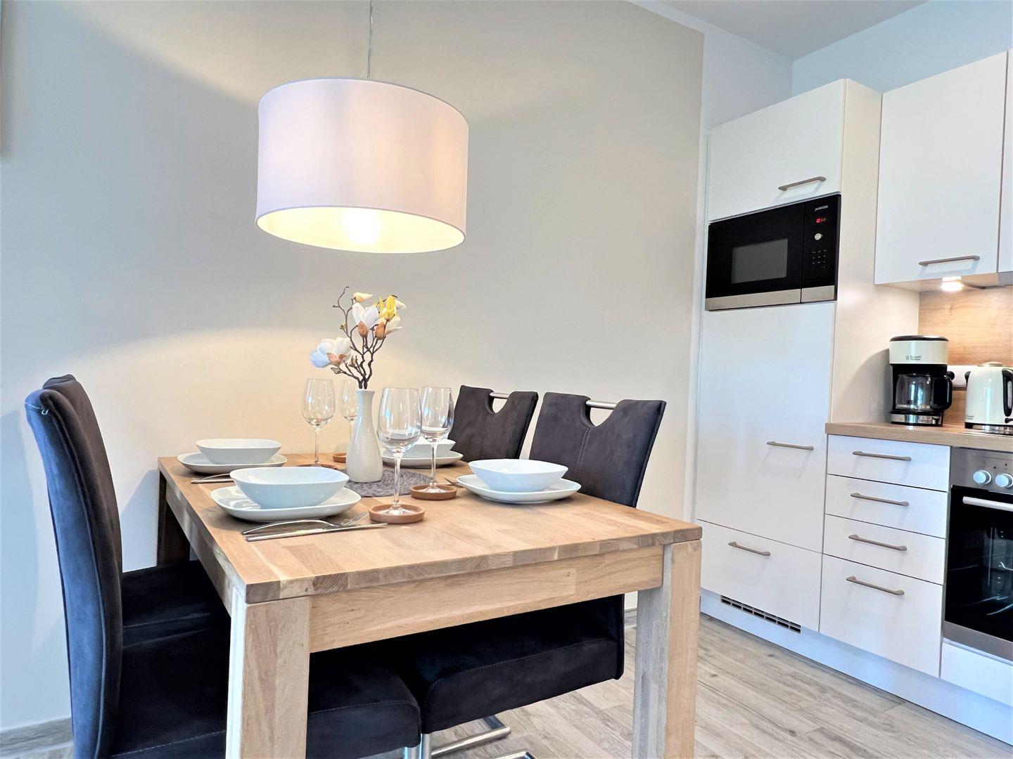 Küche und Haushalt: Einbauküche, Kühlschrank mit Gefrierfach, 4-Zonen Cerankochfeld, Backofen, Dunstabzugshaube, Mikrowelle, Geschirrspüler, Kaffeefiltermaschine, Toaster, Wasserkocher, hochwertiges Geschirr und Besteck