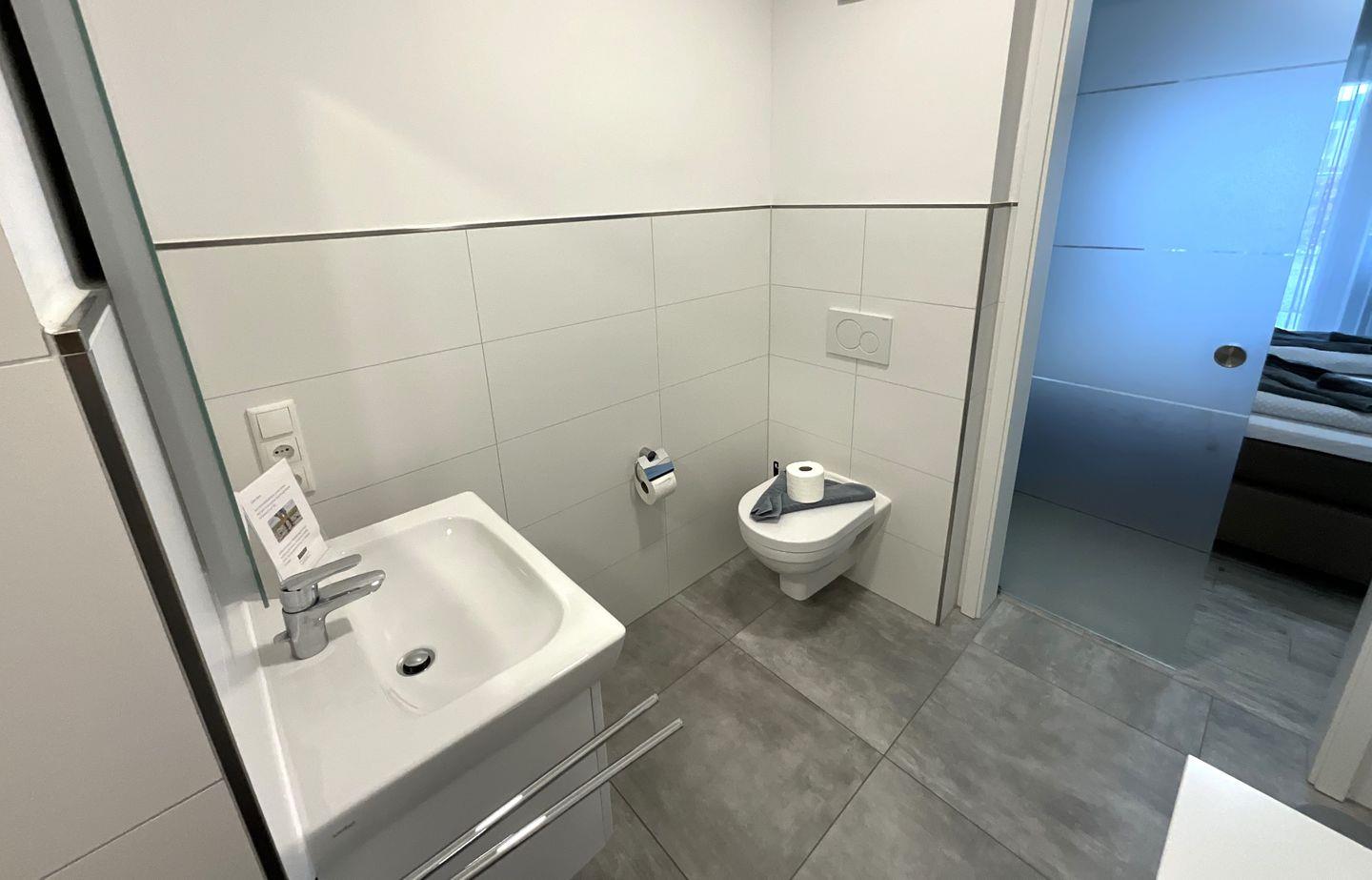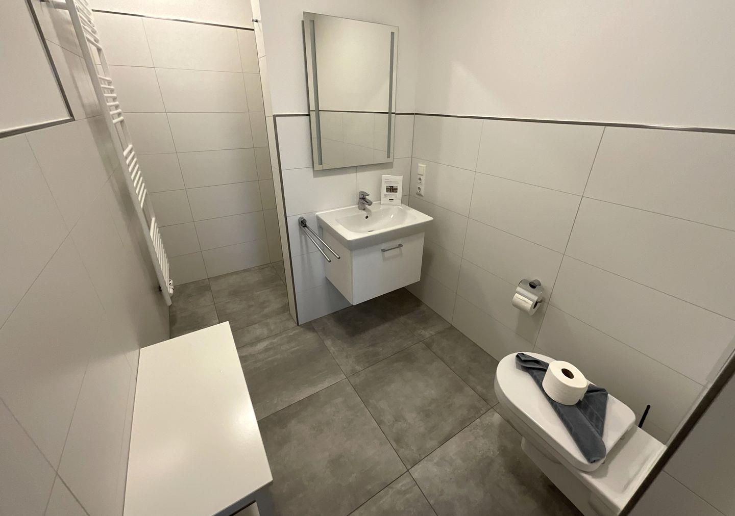 Vom Schlafzimmer geht es weiter zu Ihrem Duschbad mit WC, beleuchtetem Spiegel und begehbarer Sommerregendusche. Eine zusätzliche Ablagebank rundet das Angebot ab.