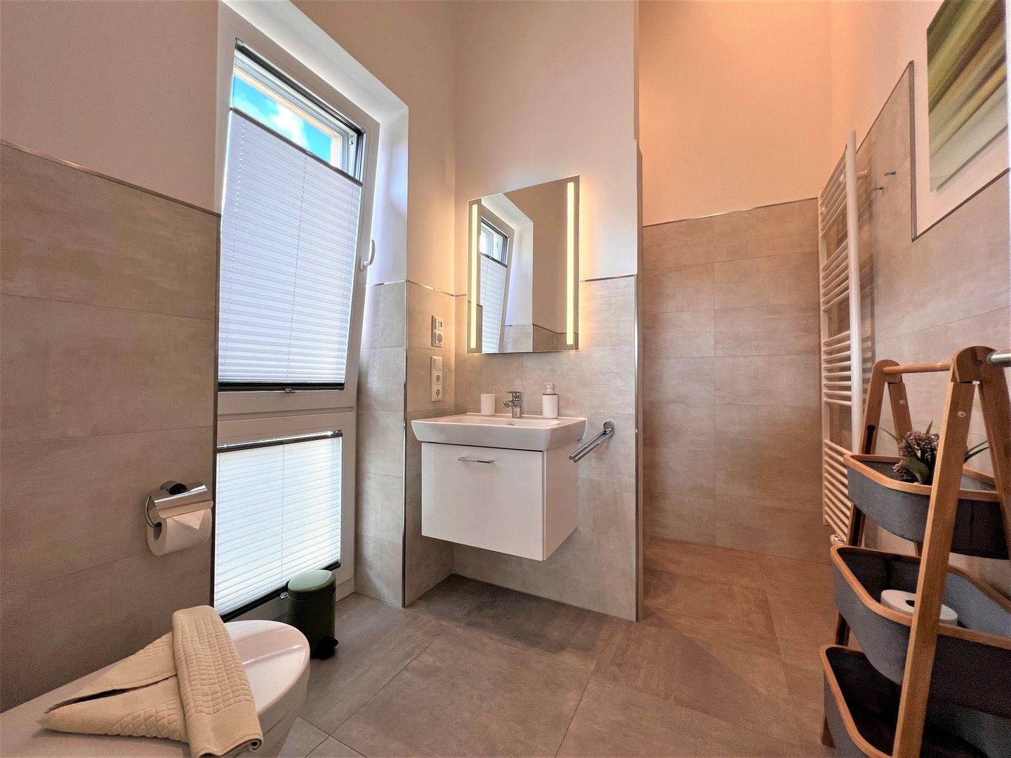 Bad und Sanitär: bodentiefe barrierefreie Dusche, Waschtischanlage, WC, Föhn