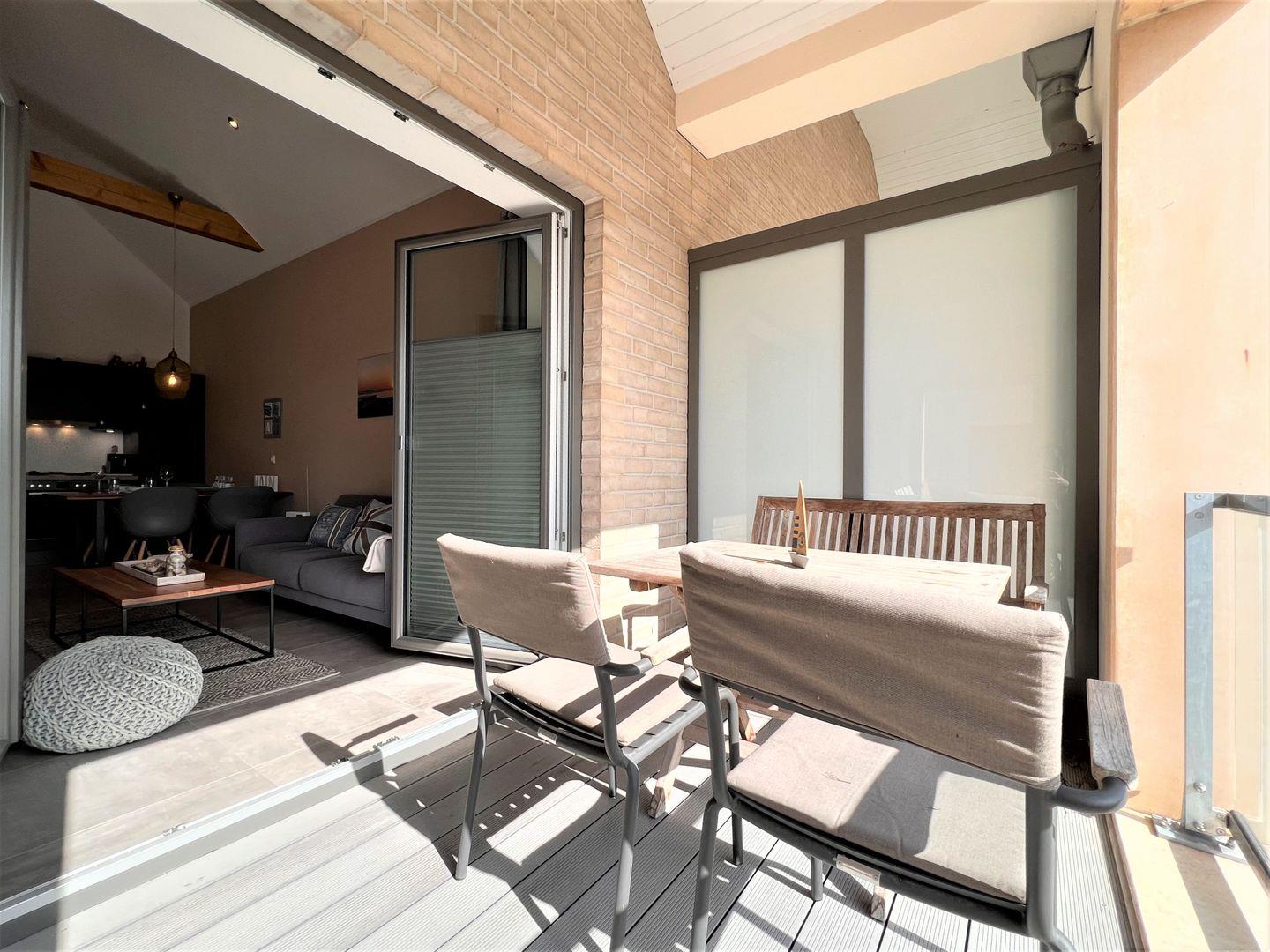 Die Ost-West Loggia ist vom Wohn- als auch vom Esszimmer erreichbar und ausgestattet mit modernen Gartenmöbeln. Diese ist über eine Stufe erreichbar und daher nicht rollstuhlgerecht.
