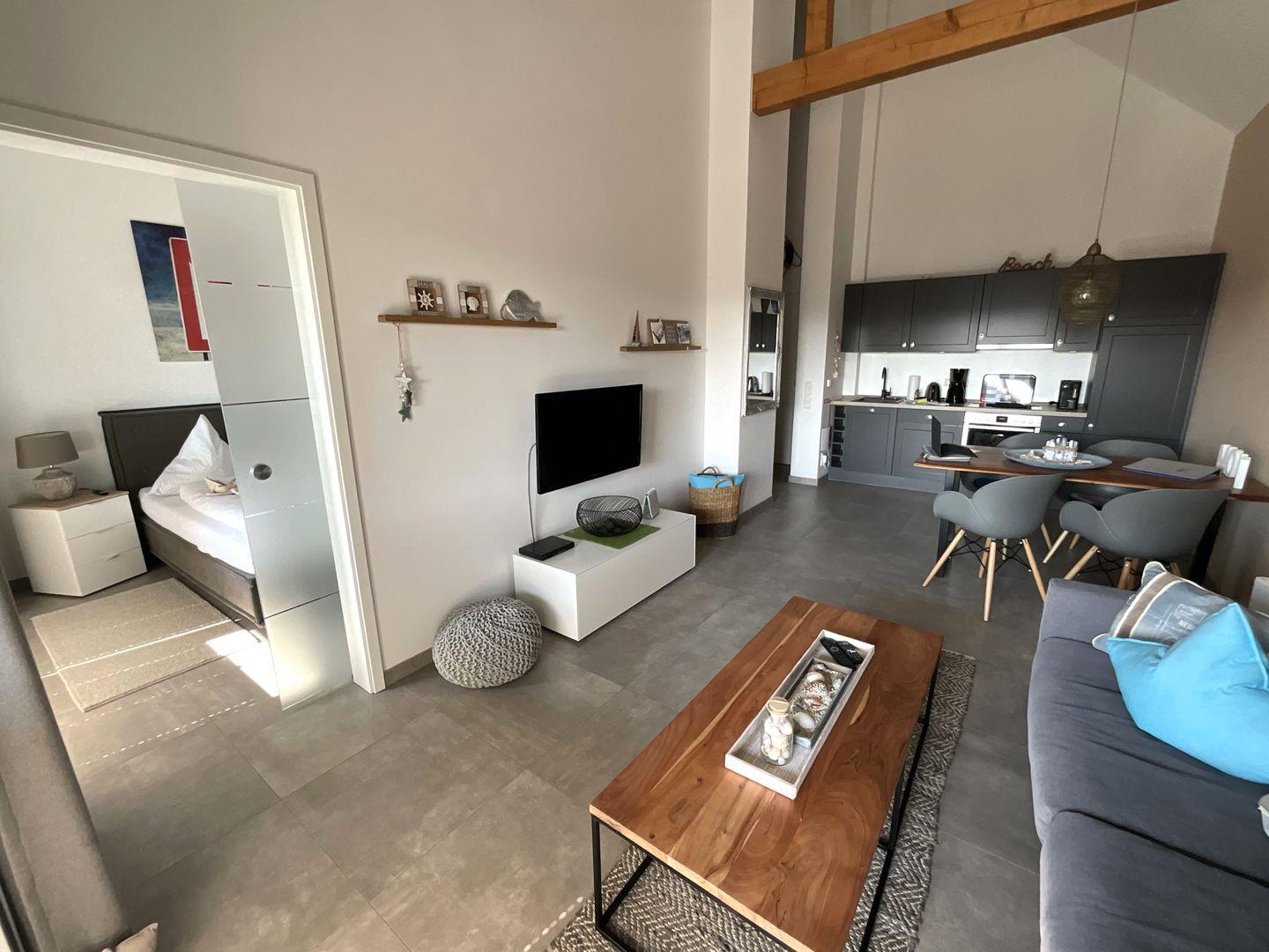 Über den Eingangsbereich mit Garderobe gelangen Sie zum Wohn- und Essbereich. Im vorderen Bereich bietet die in grau gehaltene, mit besten Markengeräten ausgestattete Küche im Landhausstil einen besonderen Fokus. Hölzerne Elemente, wie der Küchen- oder Wohnzimmertisch geben dem Raum seine Wärme, was durch die warmgelbe Wand weiter unterstützt wird. Vom Wohn-Essbereich gelangen Sie ins Schlafzimmer mit eigenem Flat-TV. Das moderne Duschbad en suite überzeugt mit heller Ausstattung, integriertem Radio, begehbarer Sommerregendusche, WC und Tageslicht.