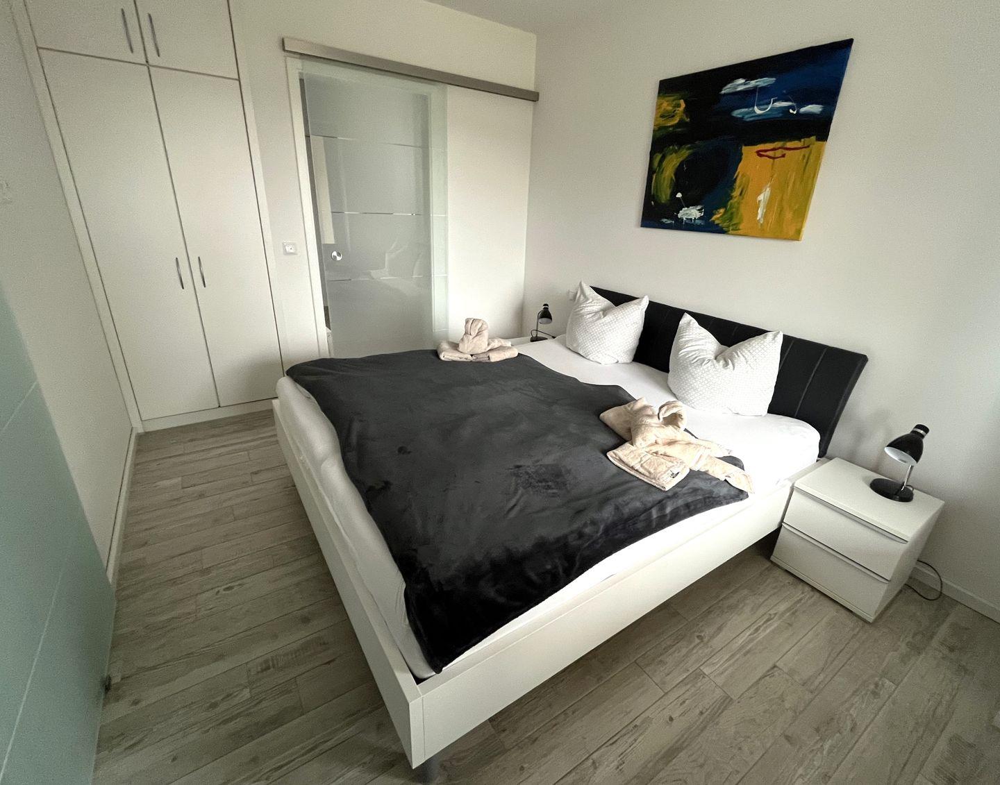 Schlafzimmer: Doppelbett (Maße: 180 x 200 cm) mit 2 Einzelmatratzen, Nachttische, Leselampen, Kleiderschrank