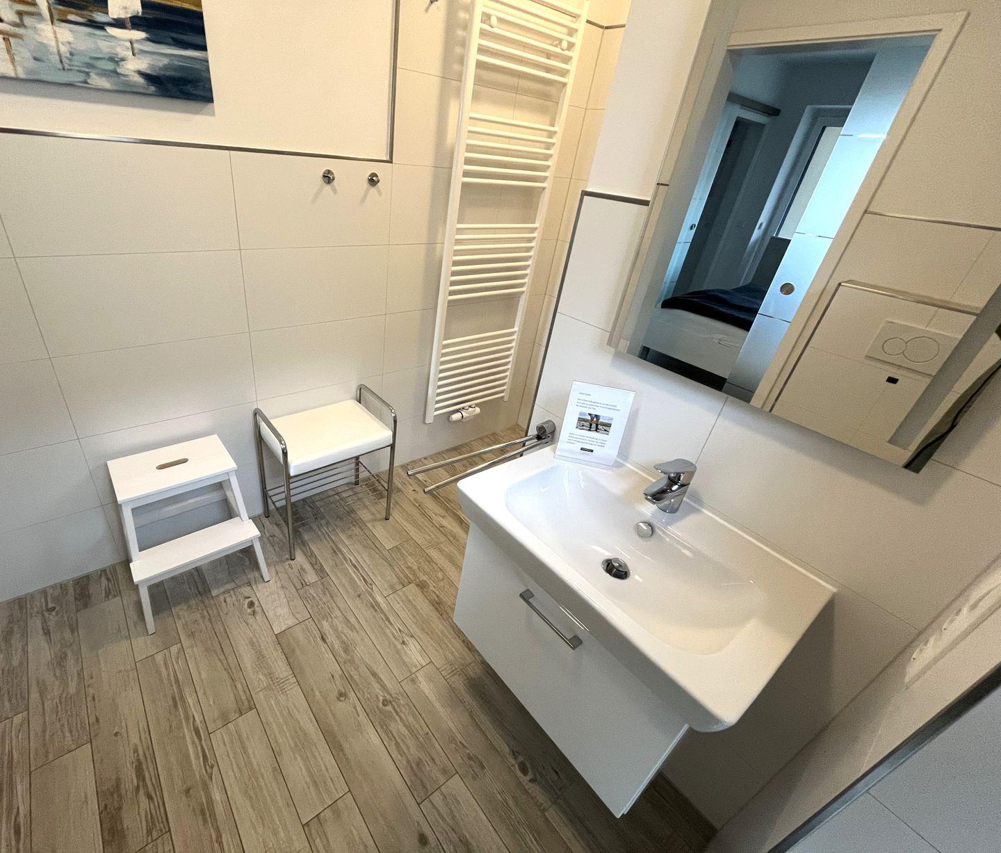 Bad und Sanitär: bodentiefe, barrierefreie Sommerregendusche mit Sitzmöglichkeit, Waschtisch mit beleuchtetem Spiegel, WC, Föhn, Handtücher auf Anfrage