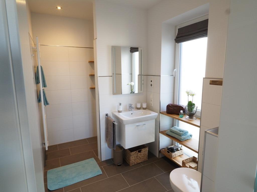 Bad und Sanitär: bodentiefe barrierefreie Dusche, Waschtischanlage, integriertes Radio, WC, Föhn