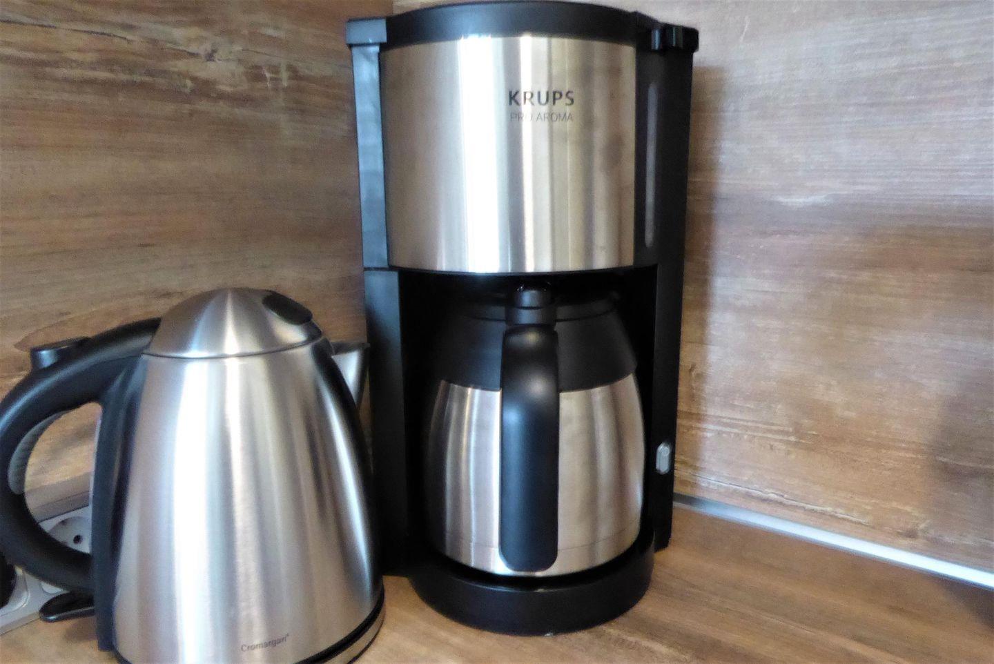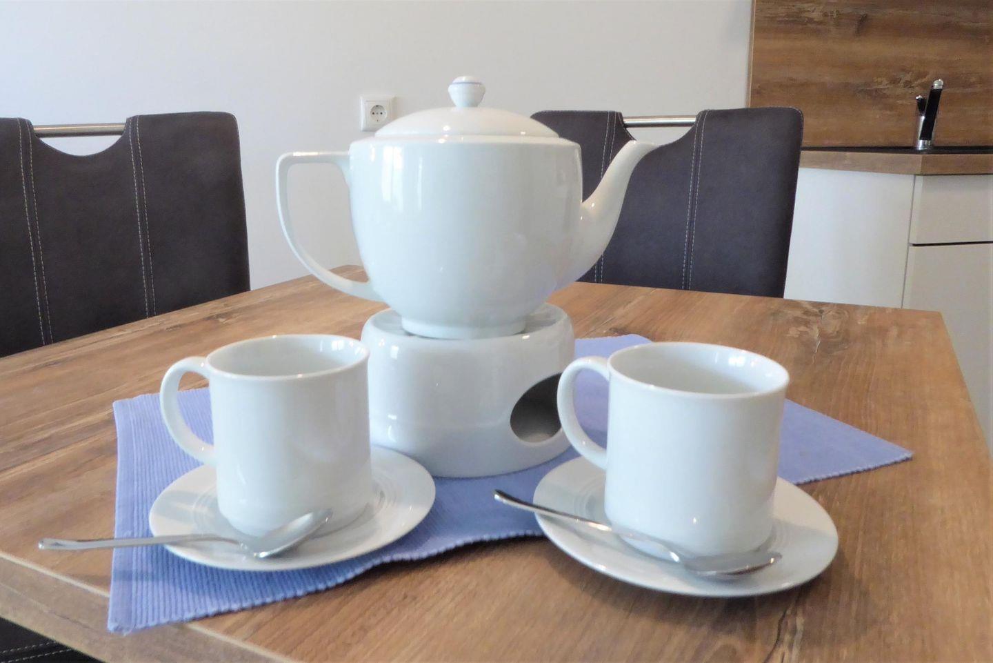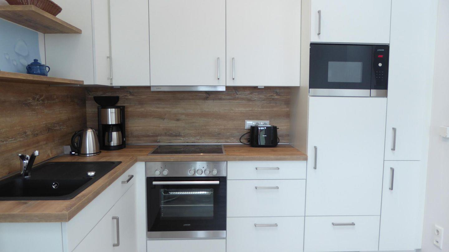 Küche und Haushalt: Einbauküche, Kühlschrank mit Gefrierfach, 4-Zonen Cerankochfeld, Backofen, Dunstabzugshaube, Geschirrspüler, Kaffeefiltermaschine, Toaster, Wasserkocher, hochwertiges Geschirr und Besteck, Eierkocher, Mikrowelle