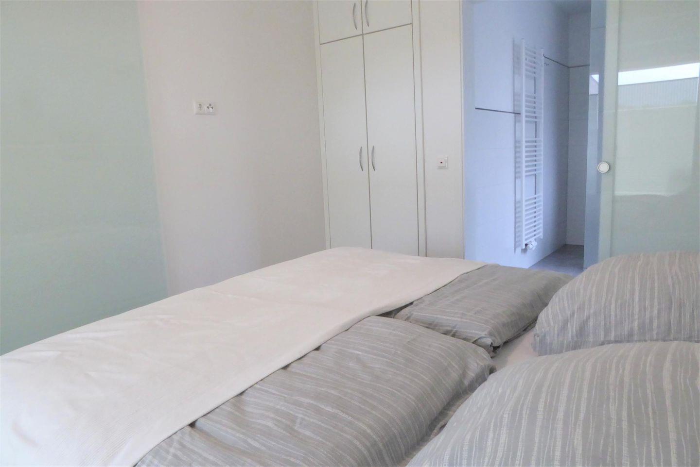 Über den Wohn-Essbereich gelangen Sie in Ihr persönliches Schlafzimmer. Das Schlafzimmer mit komfortablem Doppelbett und Kleiderschrank bietet außerdem das moderne Duschbad en suite. Die bodentiefen Fenster schaffen eine angenehme Atmosphäre und den direkten Zugang zum überdachten Balkon.