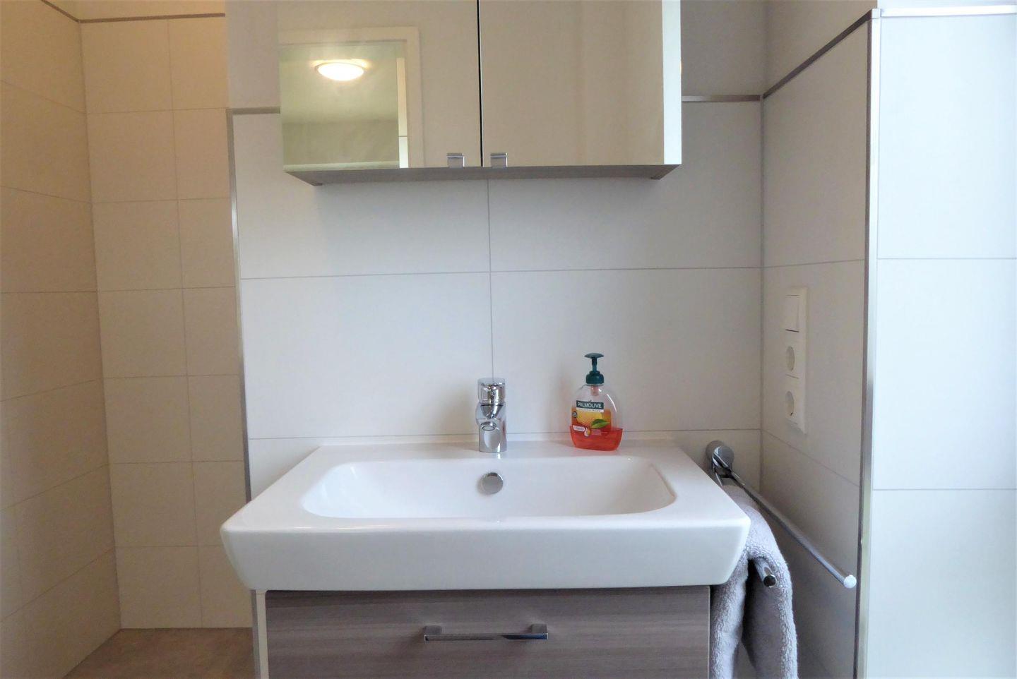 Das Duschbad mit WC, beleuchtetem Spiegel und begehbarer Sommerregendusche verfügt auch über Tageslicht.