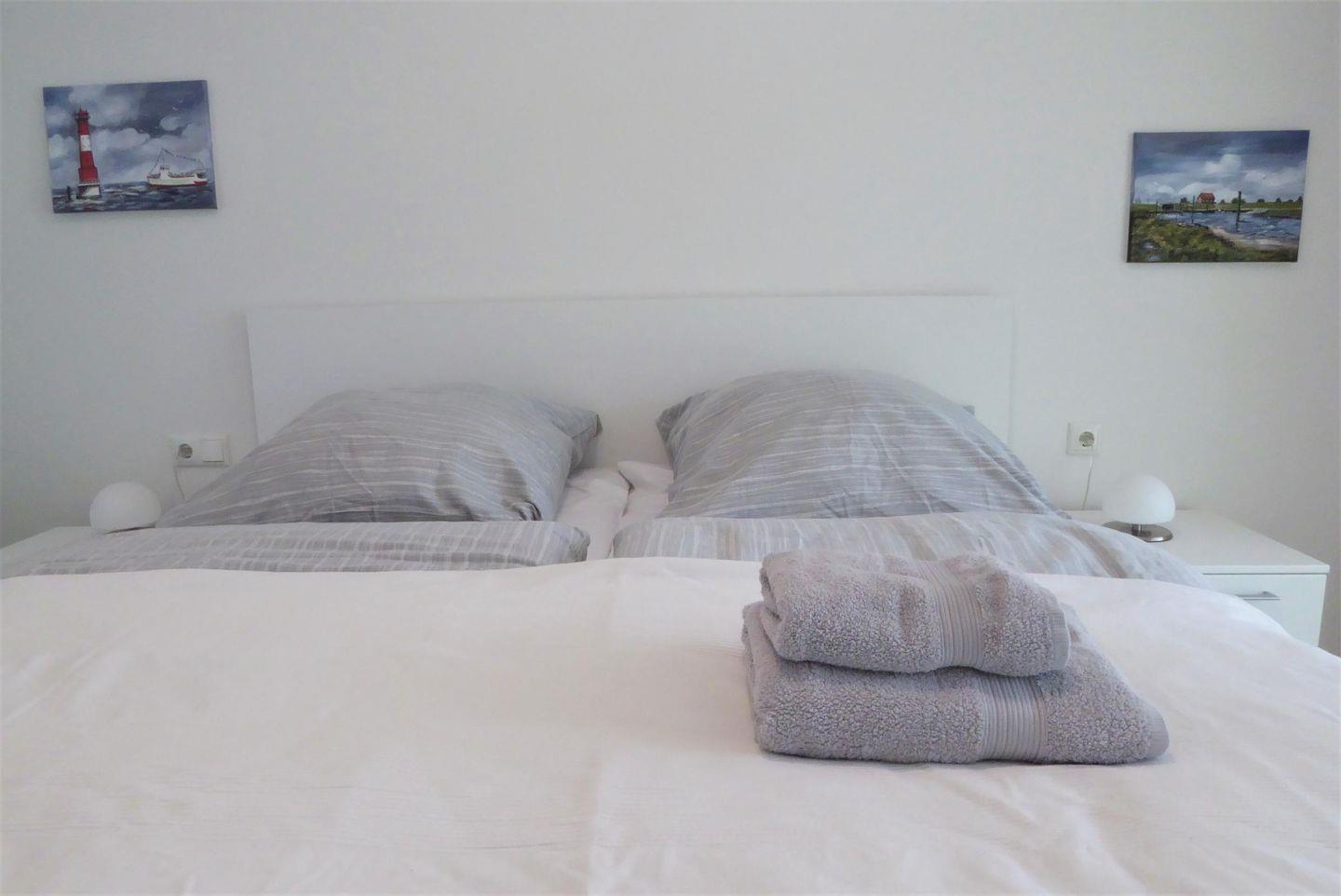 Schlafzimmer: Doppelbett (Maße: 180 x 200 cm) mit 2 Einzelmatratzen, Leselampen, Kleiderschrank
