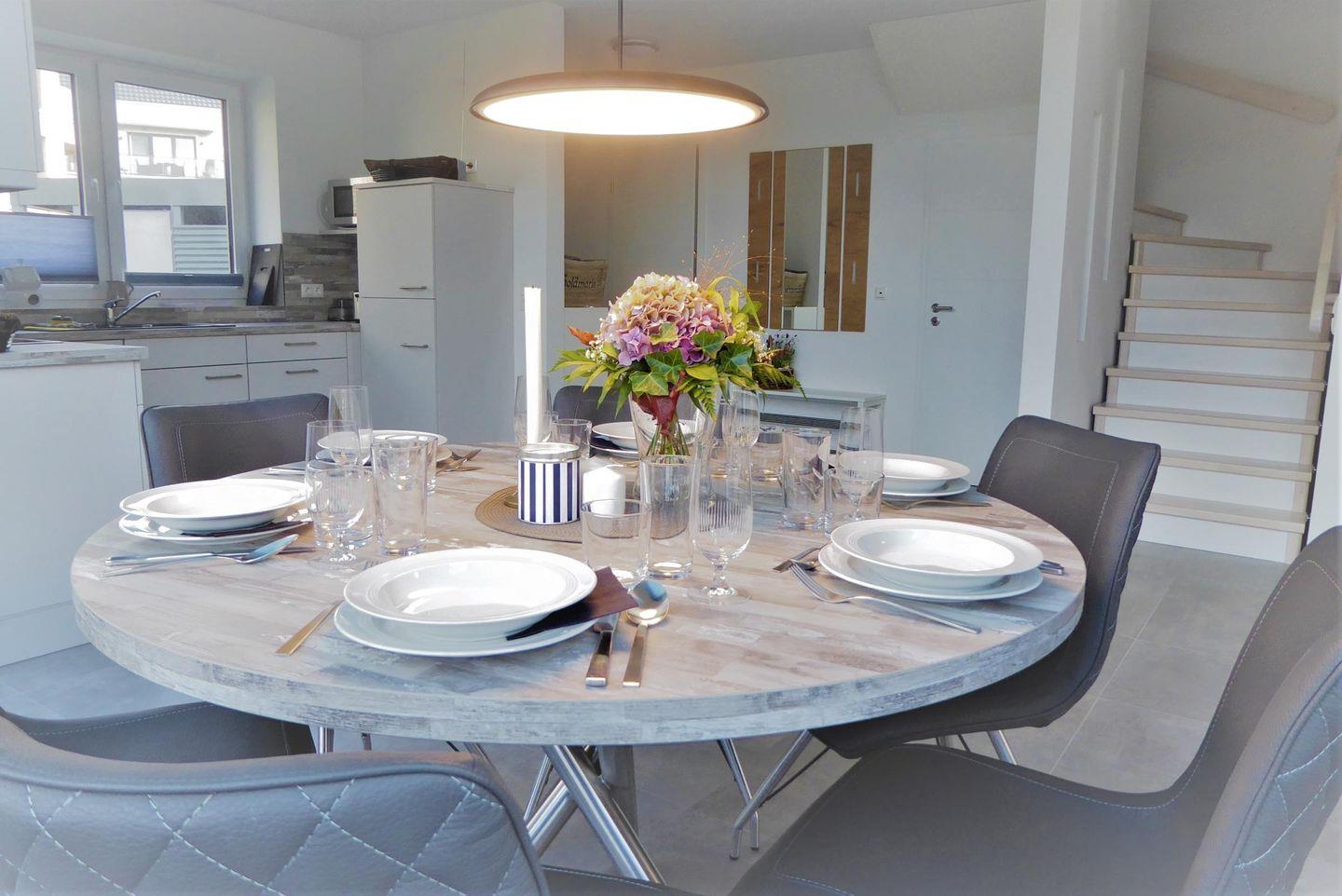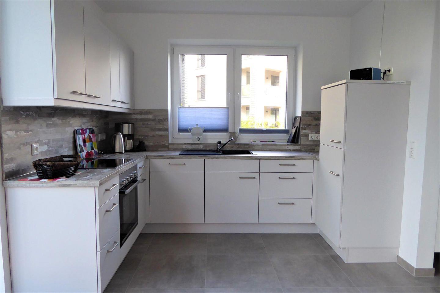 Küche und Haushalt: Einbauküche, Kühlschrank mit Gefrierfach, 4-Zonen Cerankochfeld, Backofen, Dunstabzugshaube, Mikrowelle, Geschirrspüler, Kaffeemaschine, Toaster, Wasserkocher, Eierkocher, hochwertiges Geschirr und Besteck
