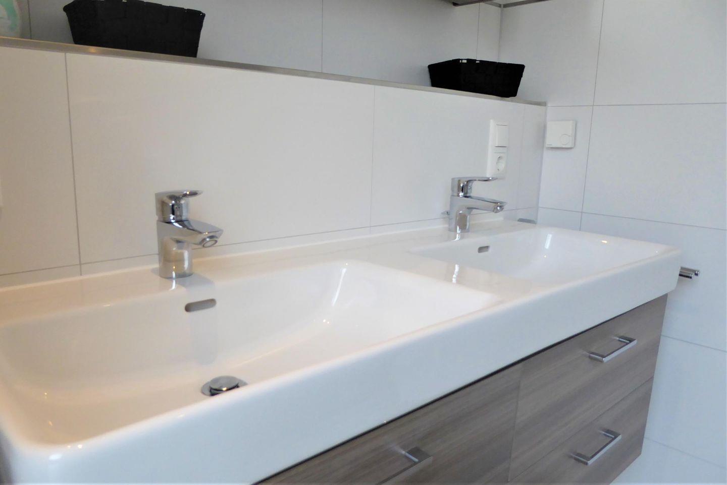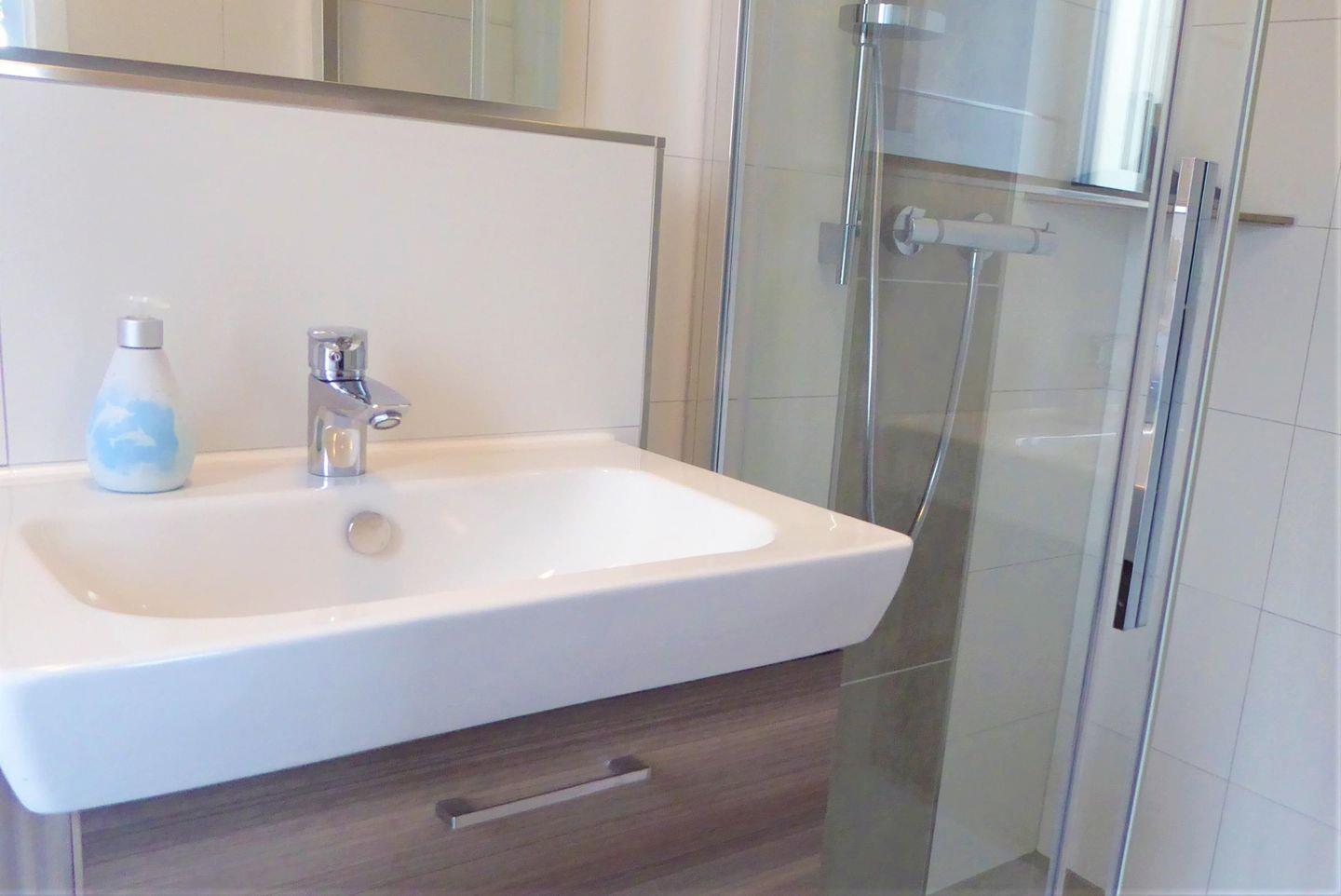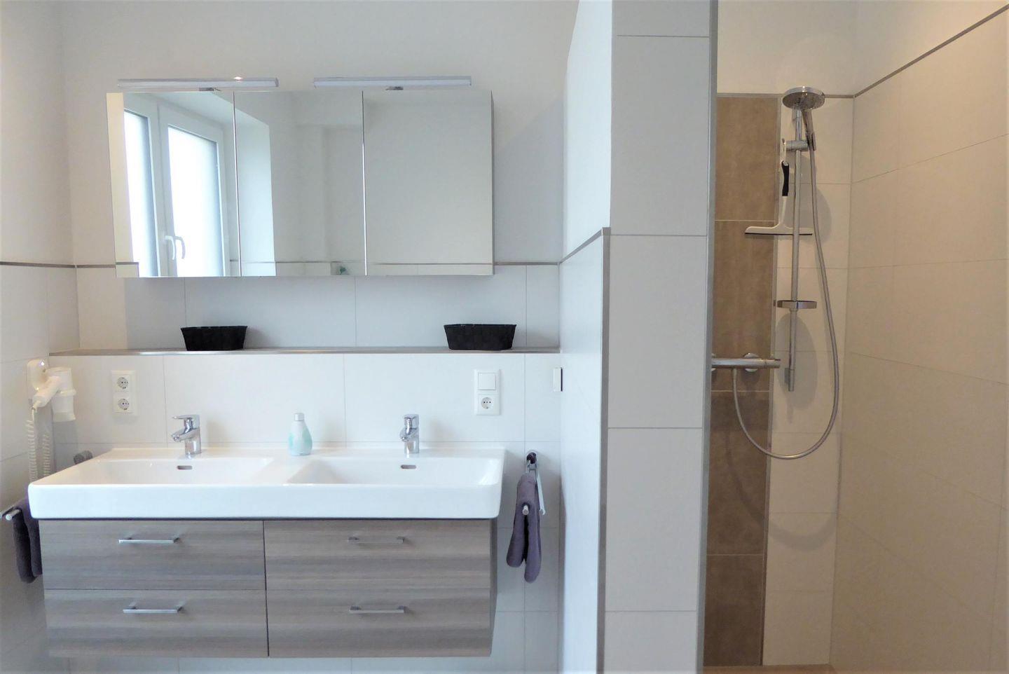 Duschbad im 1. OG: bodentiefe, barrierefreie Dusche, Waschtischanlage mit Spiegel, WC, Handtuchheizung, Föhn