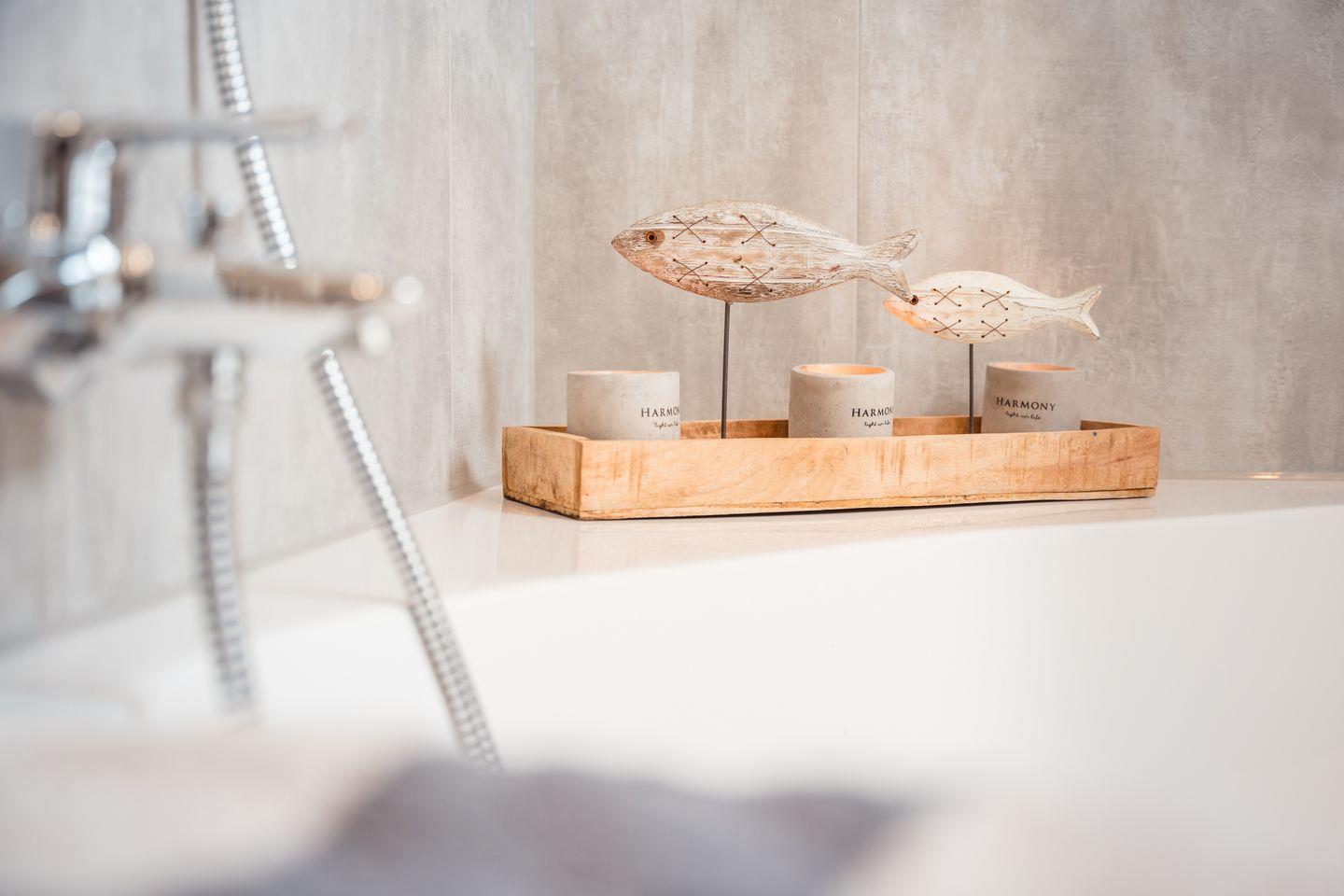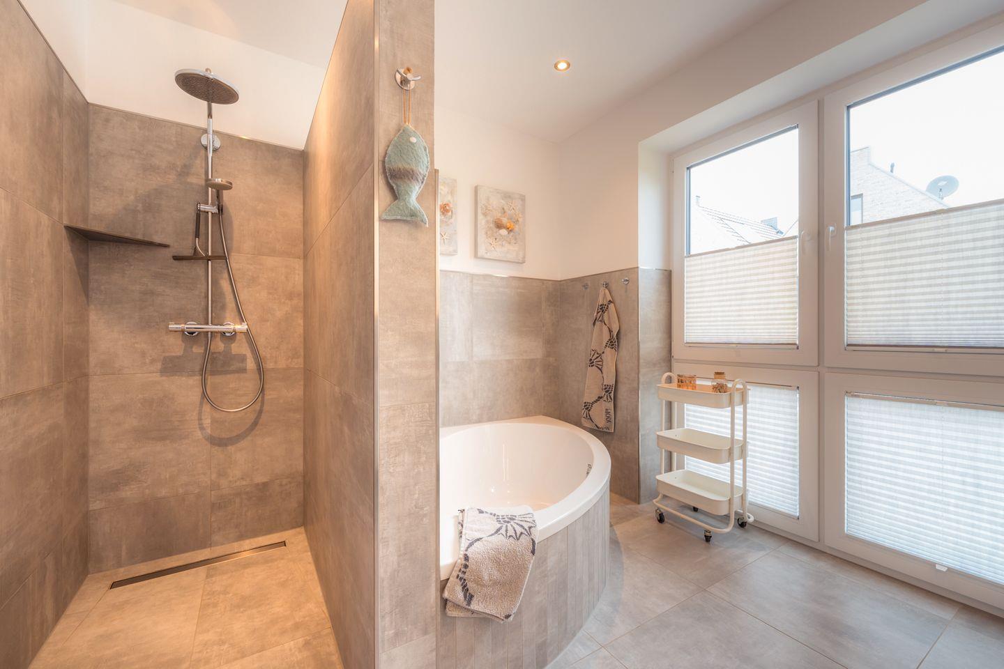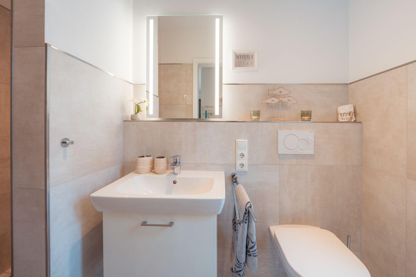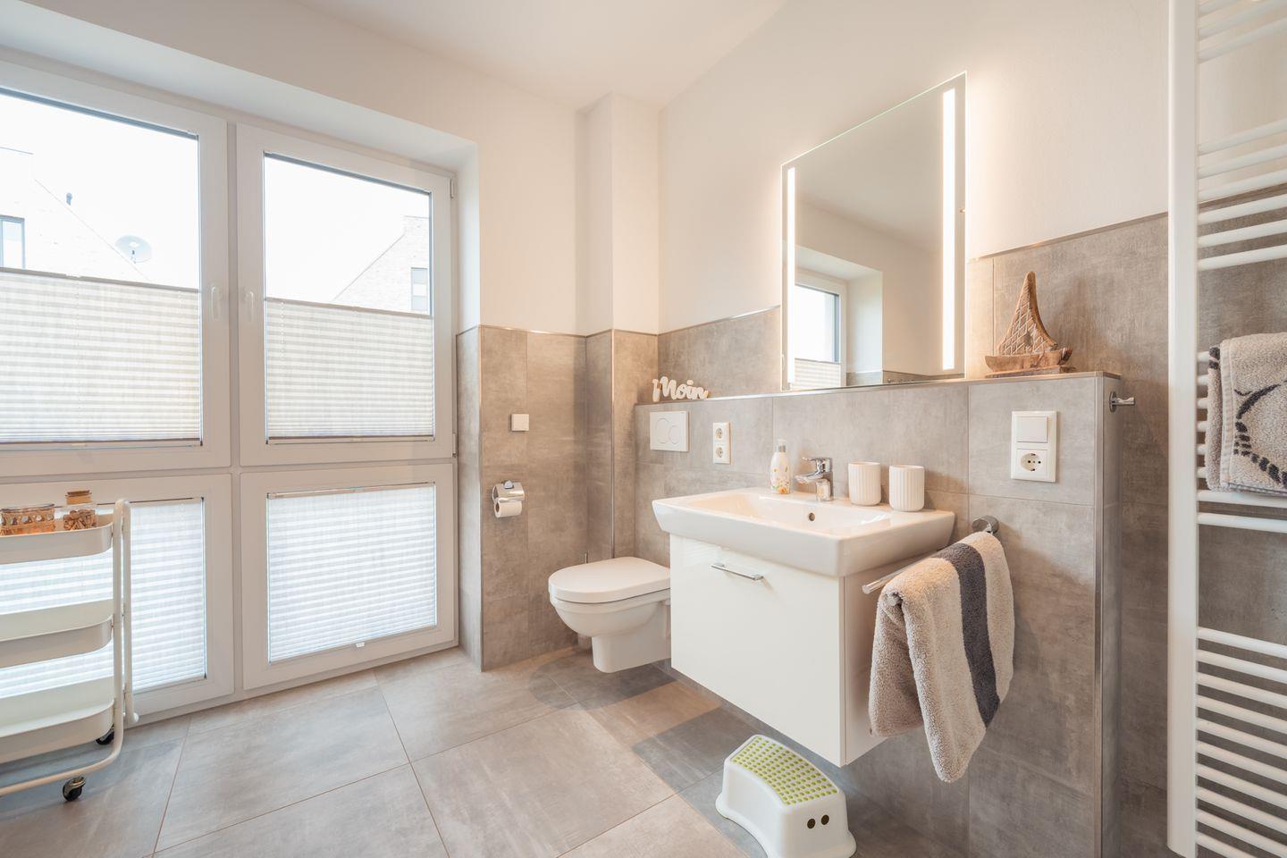 Bad und Sanitär im 1. OG: bodentiefe, barrierefreie Sommerregendusche, Badewanne, Waschtischanlage mit Spiegel, WC, Handtuchheizung, Föhn, Handtücher auf Anfrage