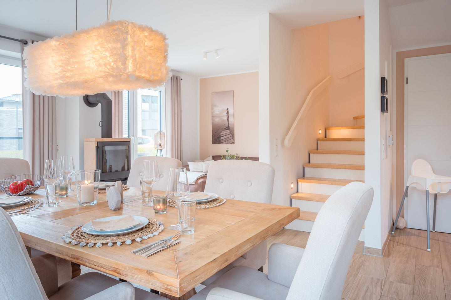 Die Einrichtung kommt elegant und stilsicher daher. Sie betreten den offenen Wohn-Essbereich und werden sich wohlfühlen: die offene Küche mit vielen Extras, der große robuste Esstisch oder die Lümmel-Eckcouch mit dem Kamin.