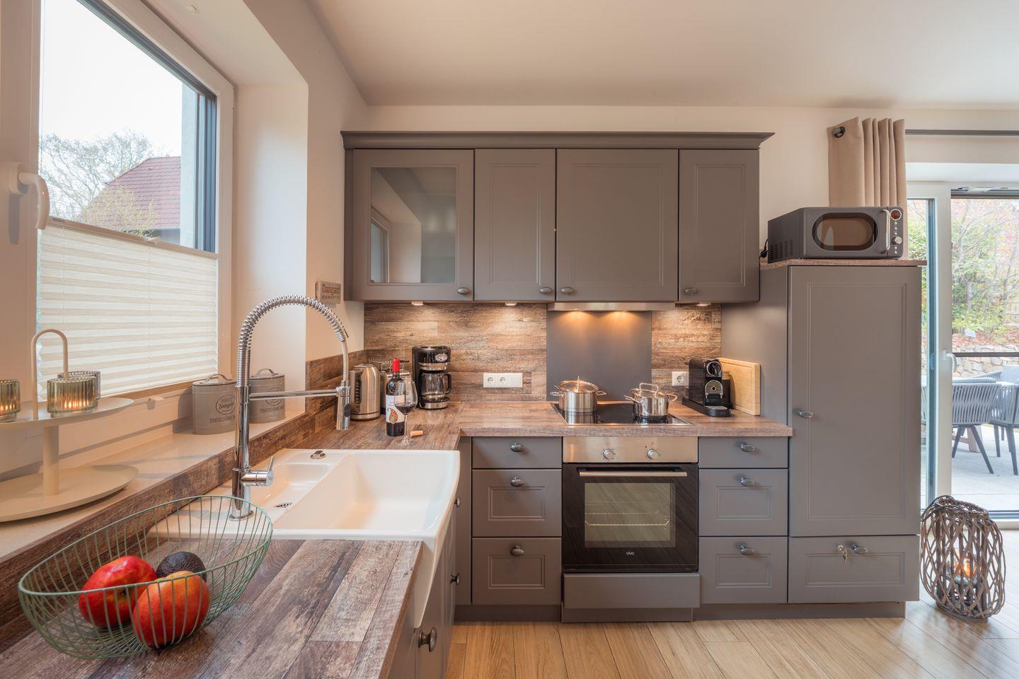 Küche und Haushalt: Einbauküche, Kühlschrank mit Gefrierfach, 4-Zonen Cerankochfeld, Backofen, Dunstabzugshaube, Mikrowelle, Geschirrspüler, Kaffeefiltermaschine + Kapselmaschine, Toaster, Wasserkocher, hochwertiges Geschirr und Besteck