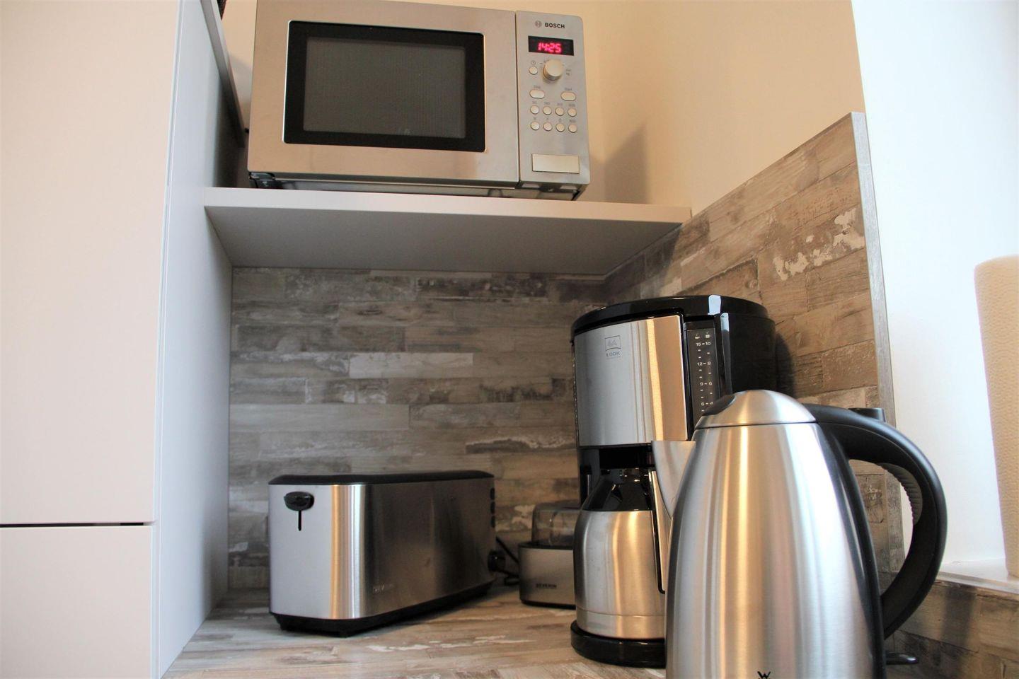 Küche und Haushalt: Einbauküche, Kühlschrank mit Gefrierfach, 4-Zonen Cerankochfeld, Backofen, Dunstabzugshaube, Mikrowelle, Geschirrspüler, Kaffeefiltermaschine, Toaster, Wasserkocher, Eierkocher, hochwertiges Geschirr und Besteck