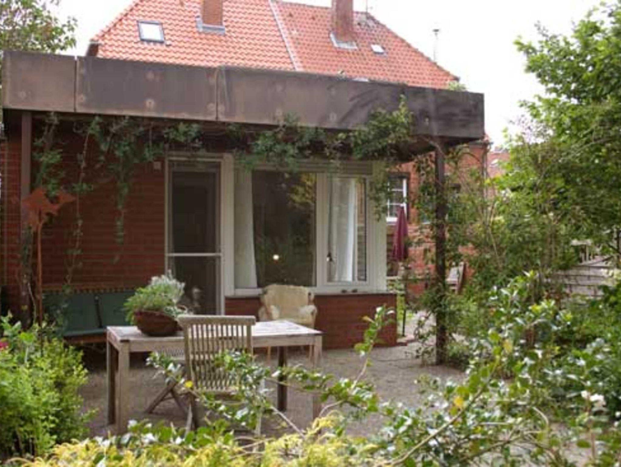 Das neu eingerichtete Zweibettzimmer liegt ebenerdig in einem Rotklinker-Bungalow mit separatem Eingang. Die großen Fenster öffnen den Blick in den kleinen Garten und auf die eigene Terrasse mit Gartenmöbeln.