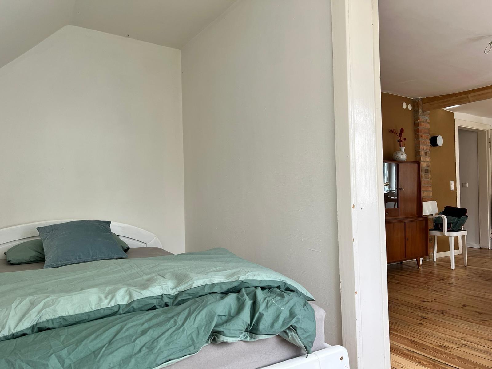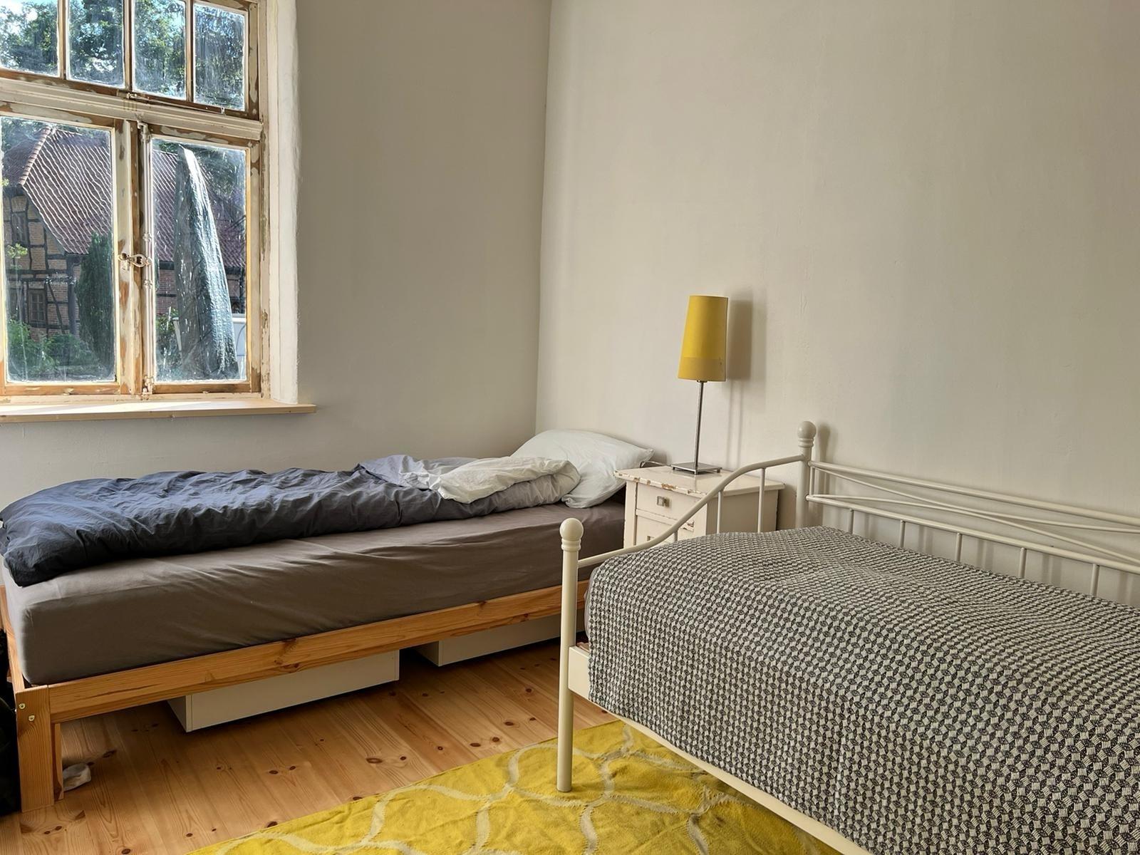 Das Haus teilt sich in zwei Wohneinheiten, die miteinander verbunden sind (Wohnung "Heinz" im EG und Wohnung "Ilse" im 1. OG). Es ist ideal geeignet für mehrere Familien oder Familienzusammenkünfte in mehreren Generationen. Auch Gruppen fühlen sich bei uns sehr wohl. Im Obergeschoss gibt es drei Schlafzimmer sowie einen gemütlichen Wohnbereich mit Küchenecke (inkl. Backofen, Herd und Spülmaschine) sowie ein Badezimmer mit Dusche und WC. Von hier hat man einen wunderschönen Blick über den Hof und das idyllische Dorf Lüggau mit seinen benachbarten Fachwerkhäusern.
