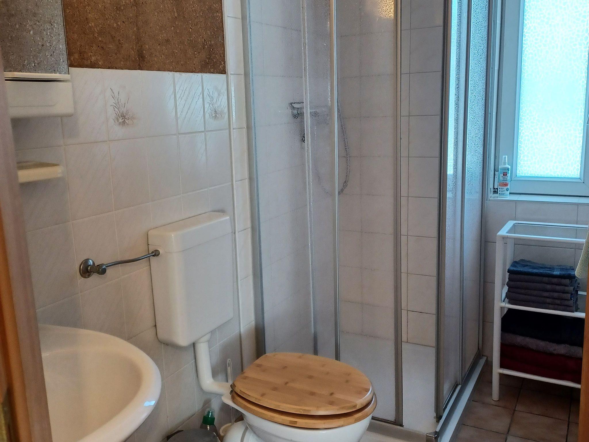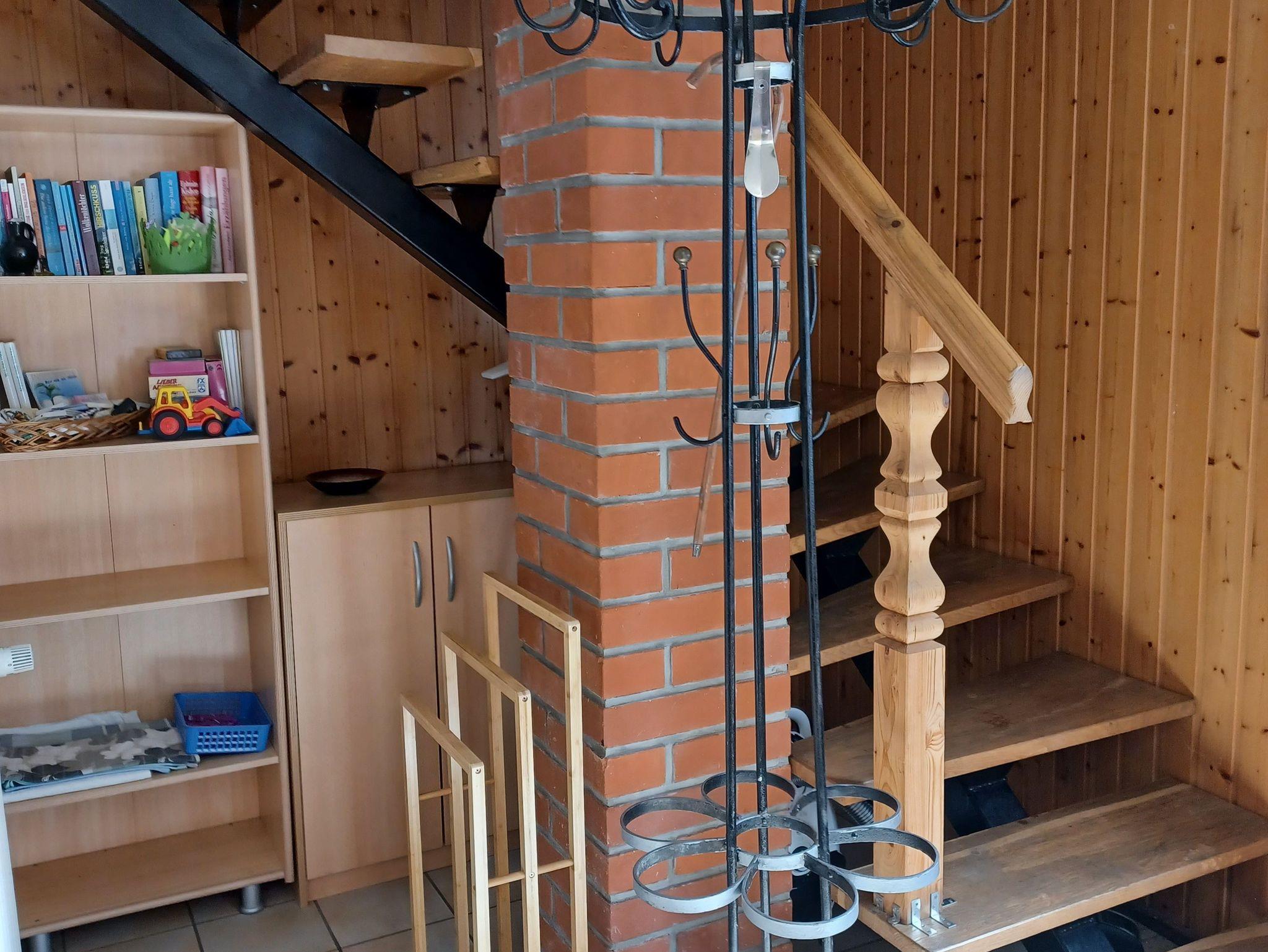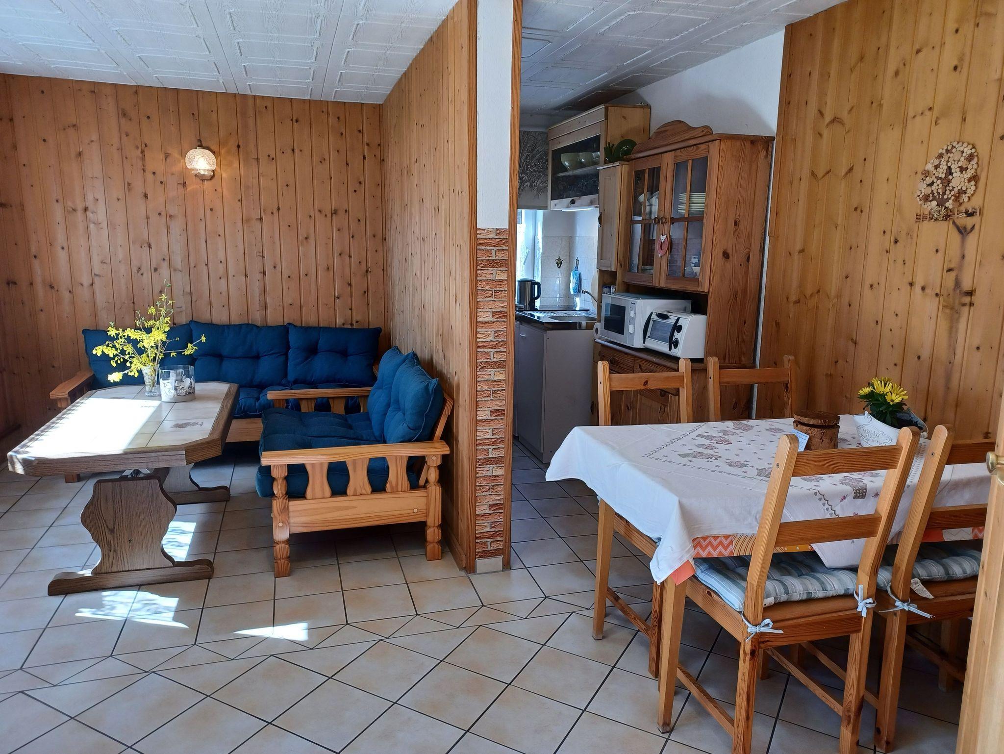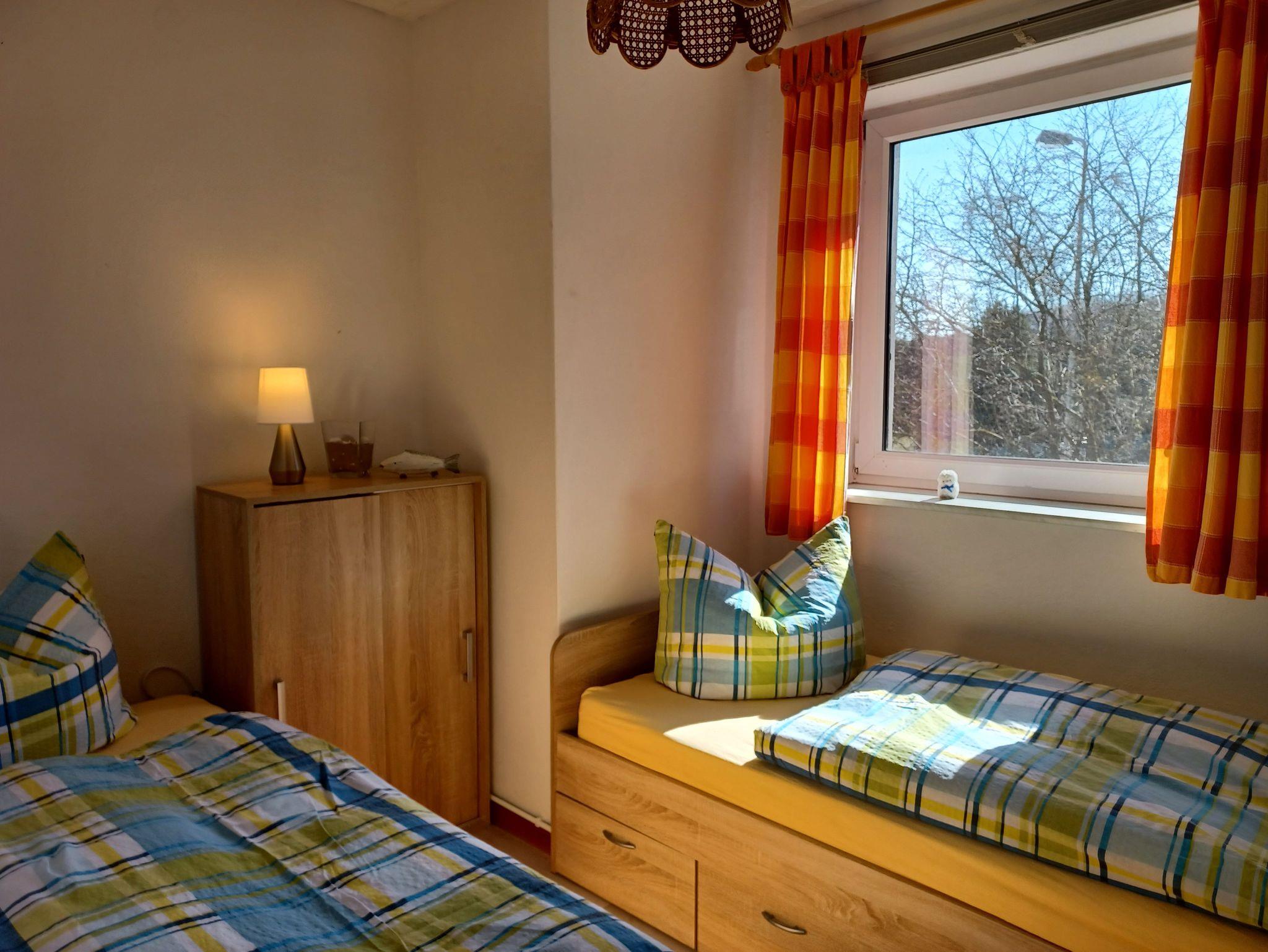 Unsere große Ferienwohnung im Landhausstil befindet sich in einem Nebengebäude auf unserem Grundstück und bietet Platz für bis zu 4 Personen. Die Wohnung erstreckt sich über zwei Etagen: Unten erwarten Sie ein gemütlicher Wohnraum, eine Kochecke sowie das Bad. Im Obergeschoss befinden sich zwei separate Schlafräume; im zweiten Schlafzimmer stehen zwei Einzelbetten (80 × 180 cm) zur Verfügung.