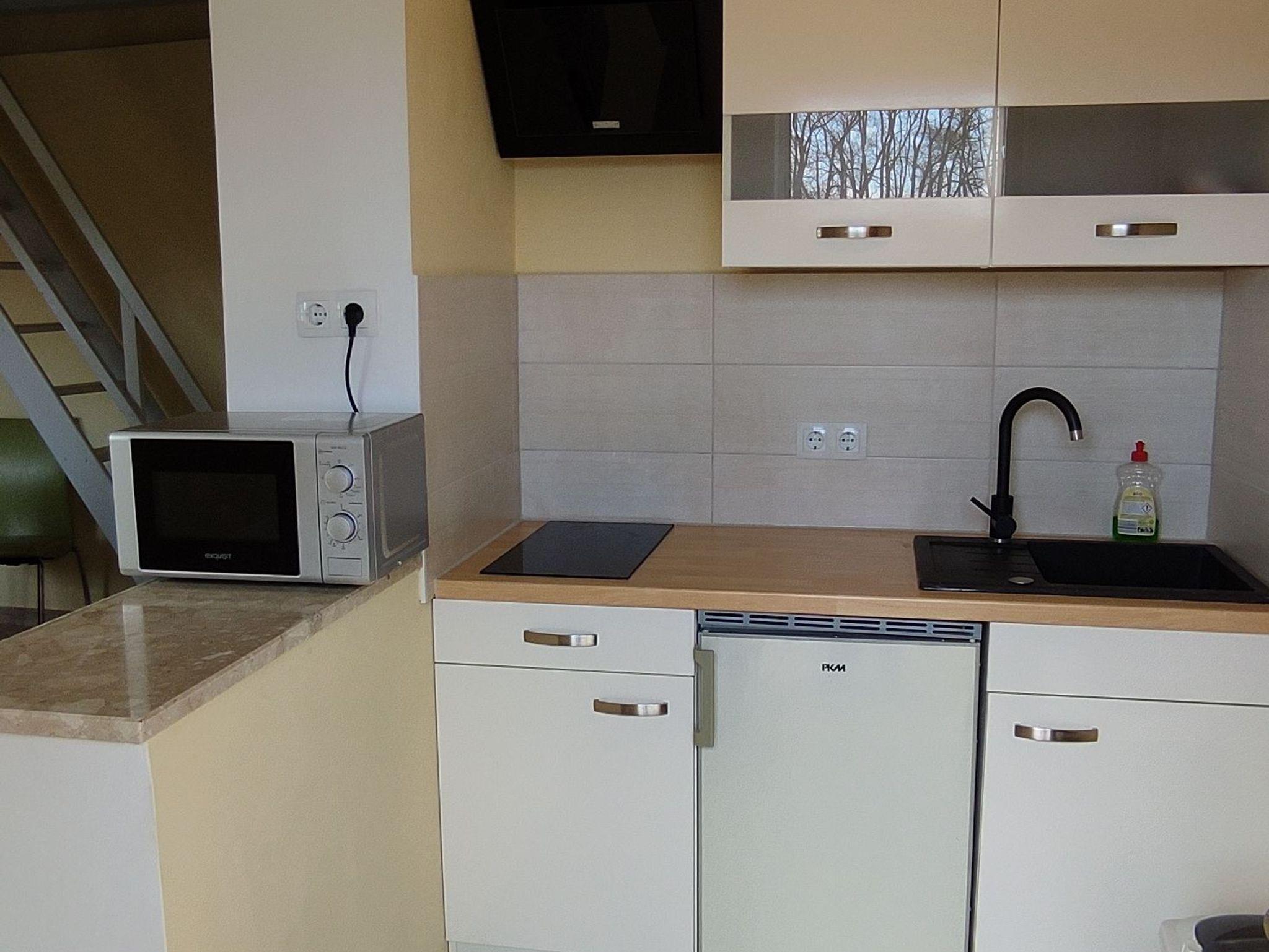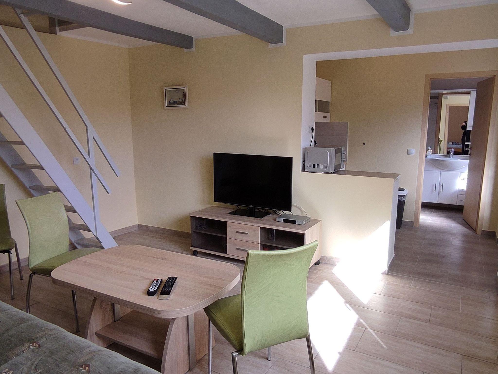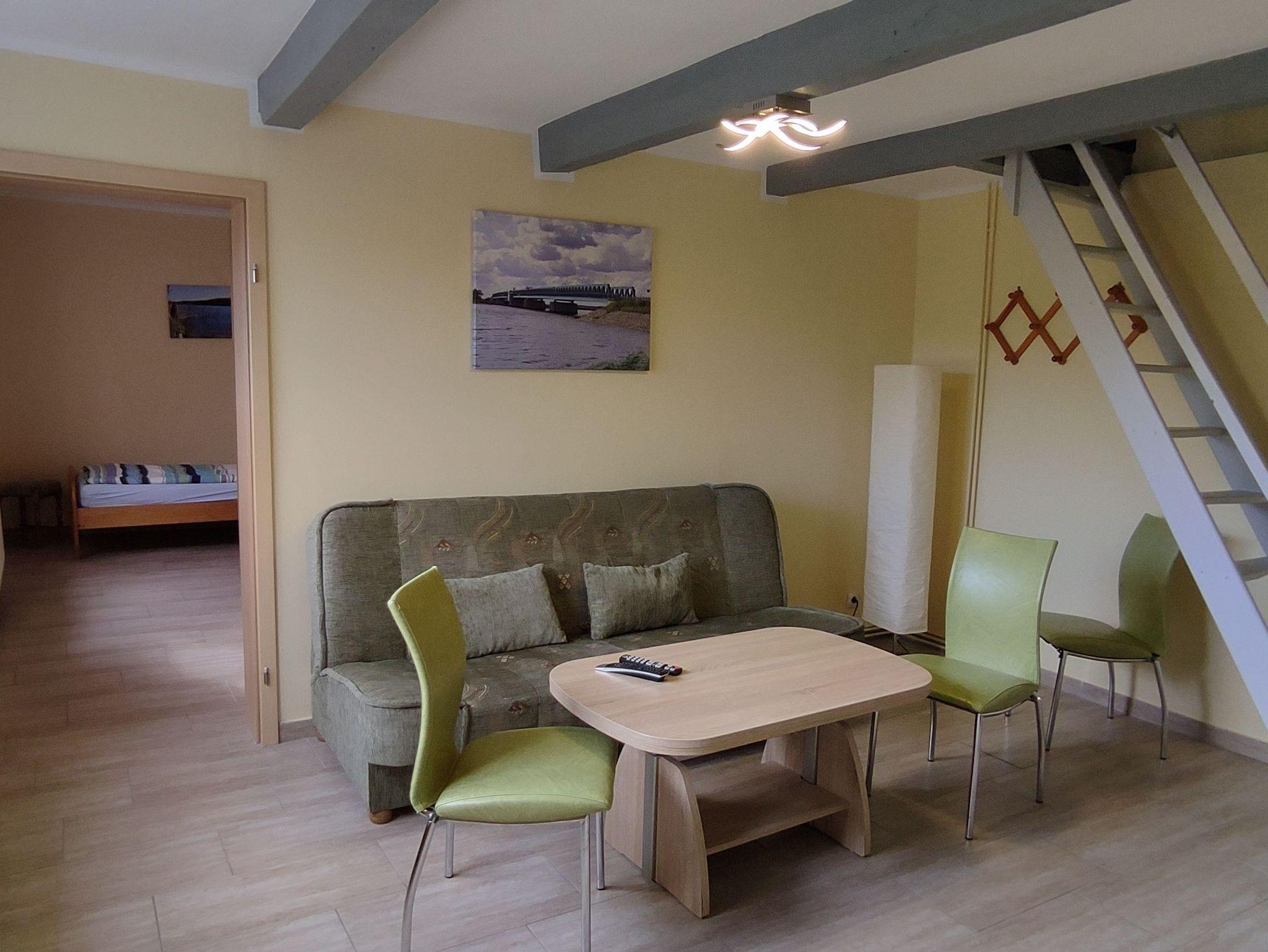 Erdgeschoss & 1. Obergeschoss, 40 m², für 4 Personen; Wohnzimmer mit Radio und Sat-TV, Couch, Tisch und Stühle; Kleiderschrank, Raumspartreppe zum Schlafzimmer; Schlafzimmer mit Doppelbett, Nachtschränken und 2 Einzelbetten; Küche mit Küchenzeile, Wasserkocher, Toaster, Kühlschrank, Microwelle, Kaffeemaschine, 2 - Plattenkochfeld Badezimmer (Dusche und WC), Badezimmermöbel; Terrasse vor der Wohnung mit Massivgrill und Sitzmöbeln