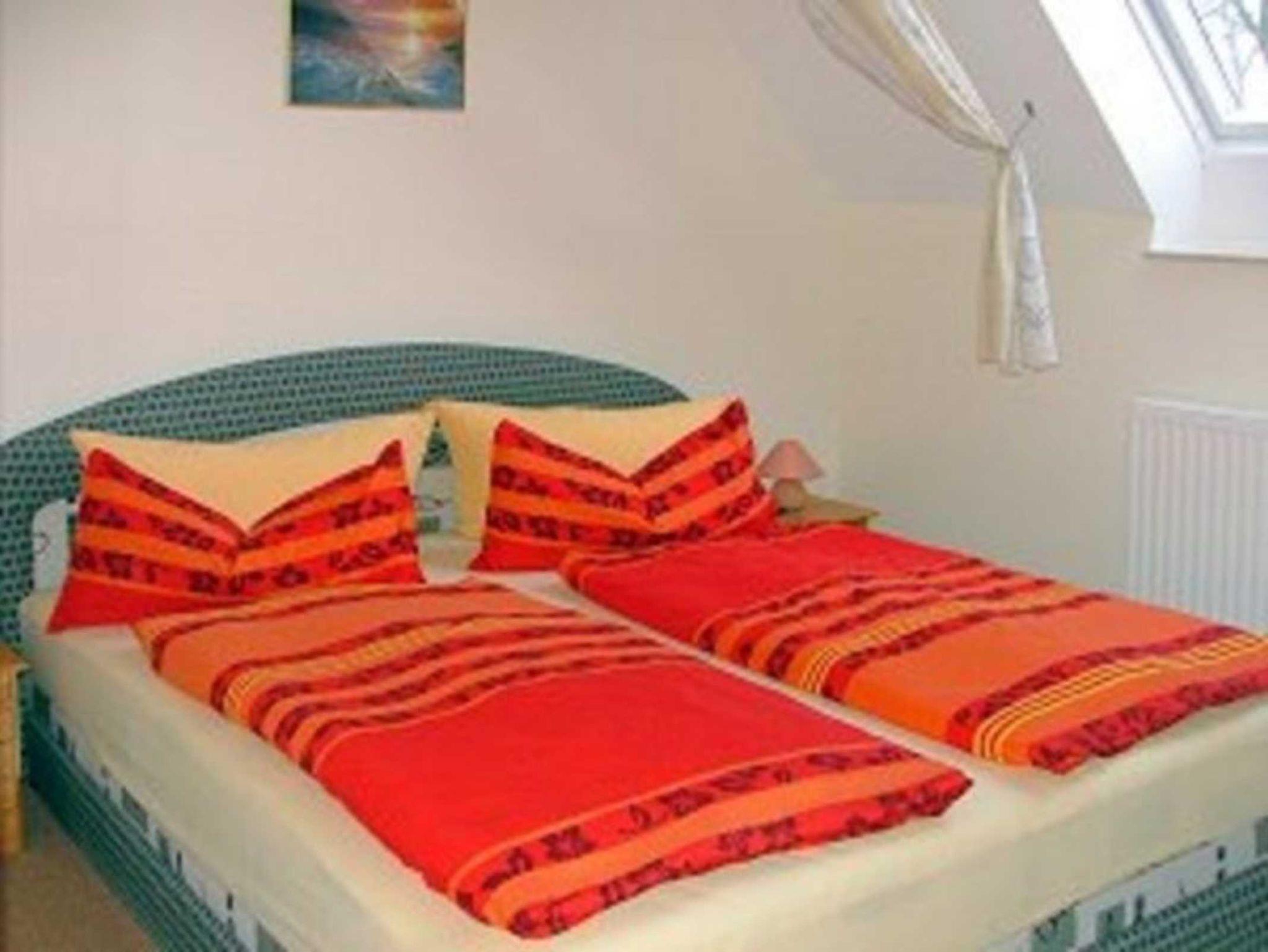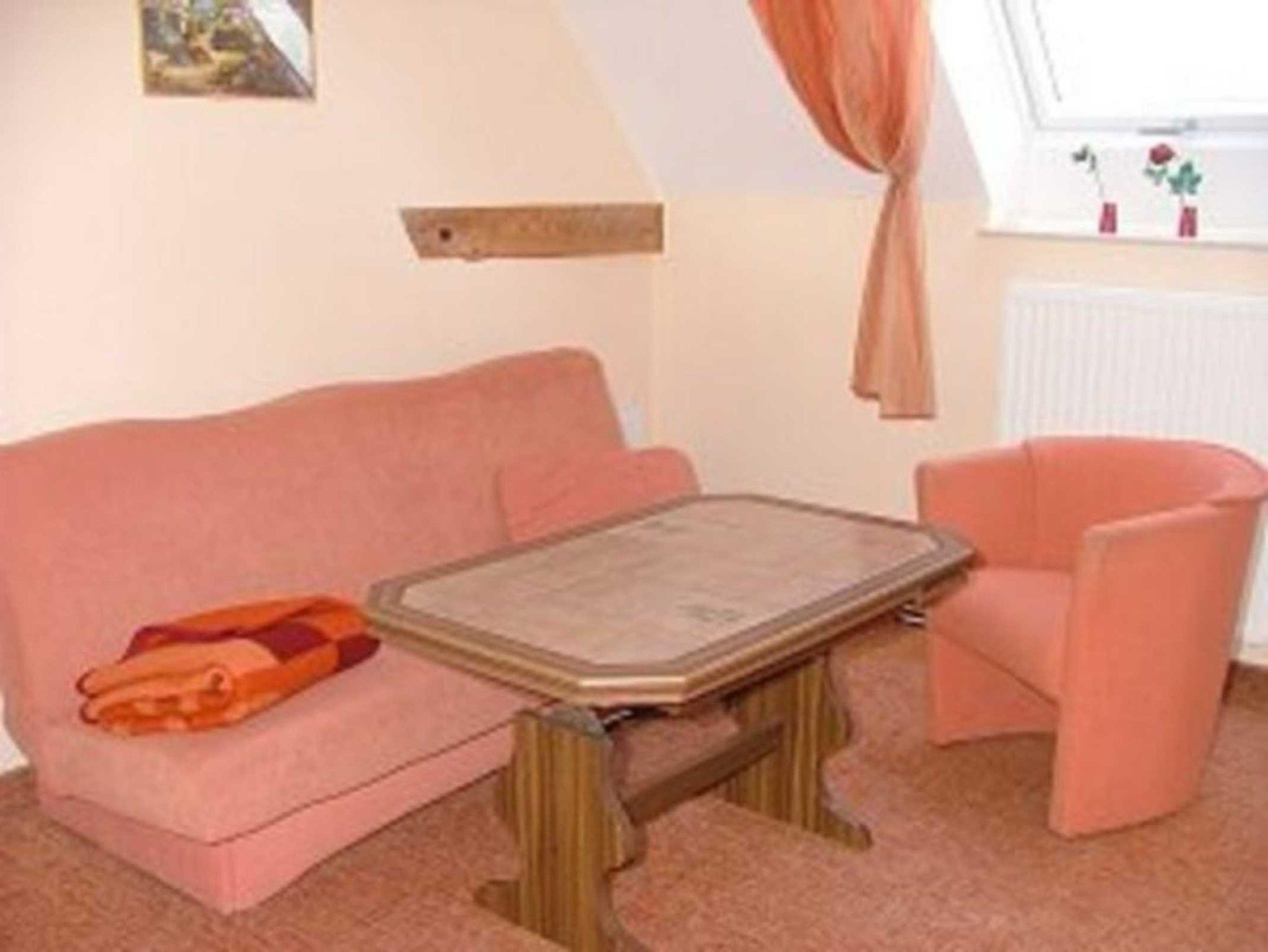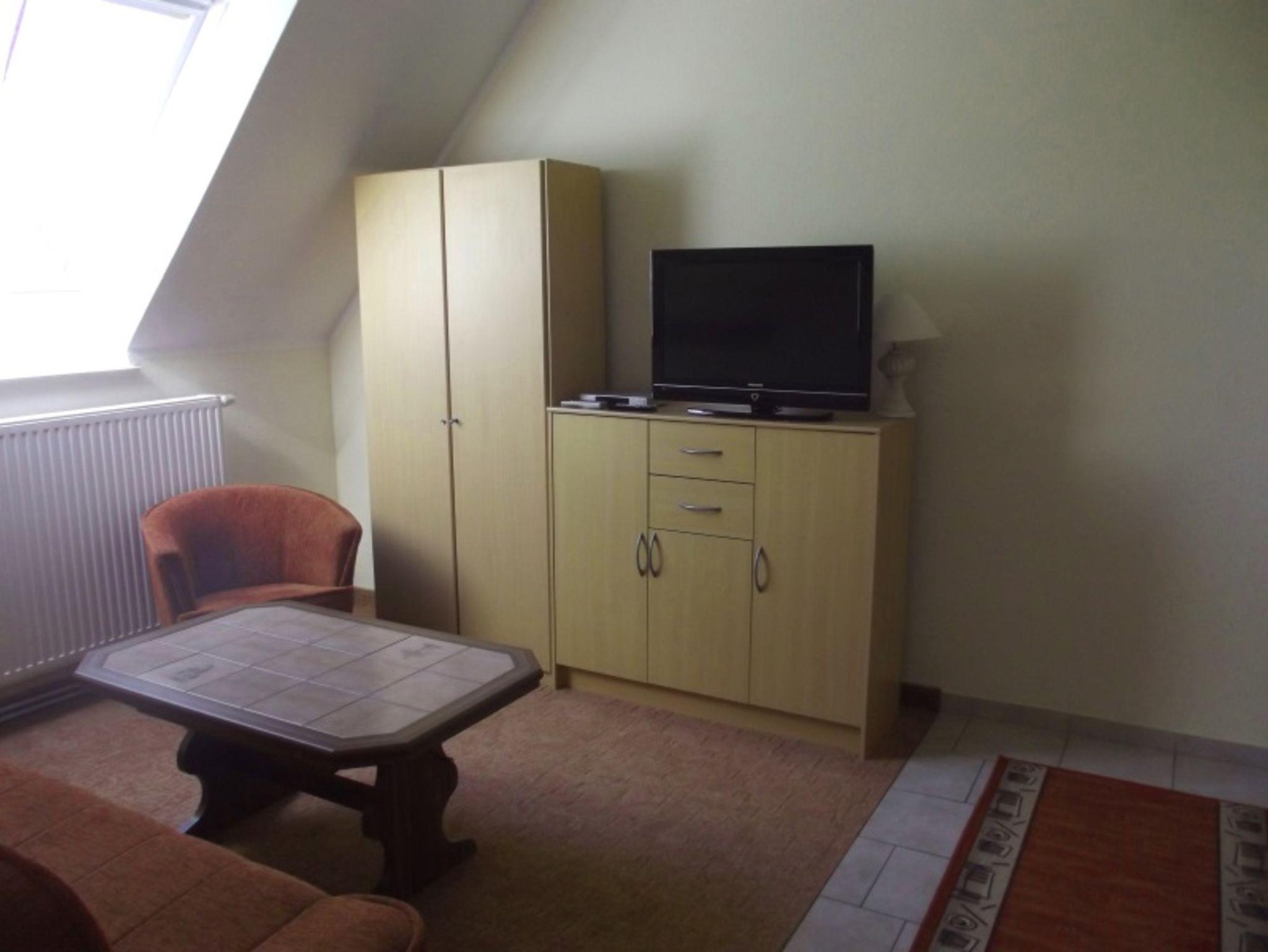 2005 neu eingerichtet, 1. OG, 34 m², ruhige Lage, für maximal 3 Erwachsene; Wohnzimmer mit Couch, Couchtisch, Stuhl, kleine Schrankwand mit Sat-TV komplette Küchenzeile mit E-Herd und Backofen, Wasserkocher, Toaster, Kaffeemaschine, Microwelle separates Schlafzimmer mit Doppelbett und Nachtschränken, separates Badezimmer mit Dusche und WC, kleiner Flur, Sitzgelegenheit mit Gartenmöbeln auf dem Grundstück.