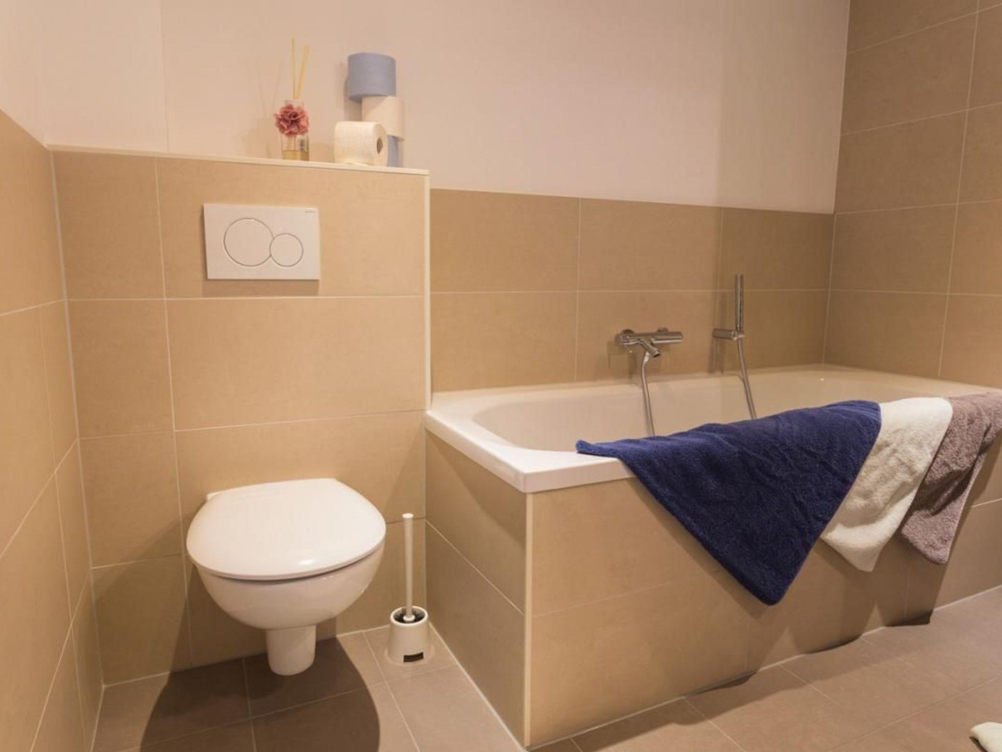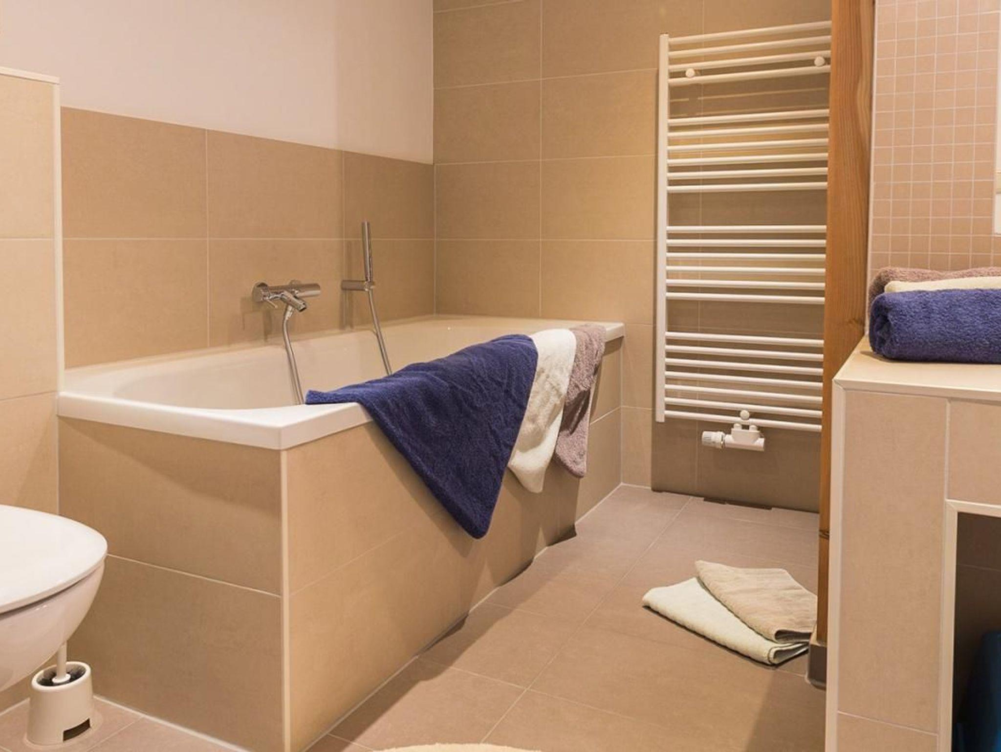 Das Badezimmer verfügt über eine große Dusche, eine zusätzliche Badewanne, WC und über einen Waschtisch.