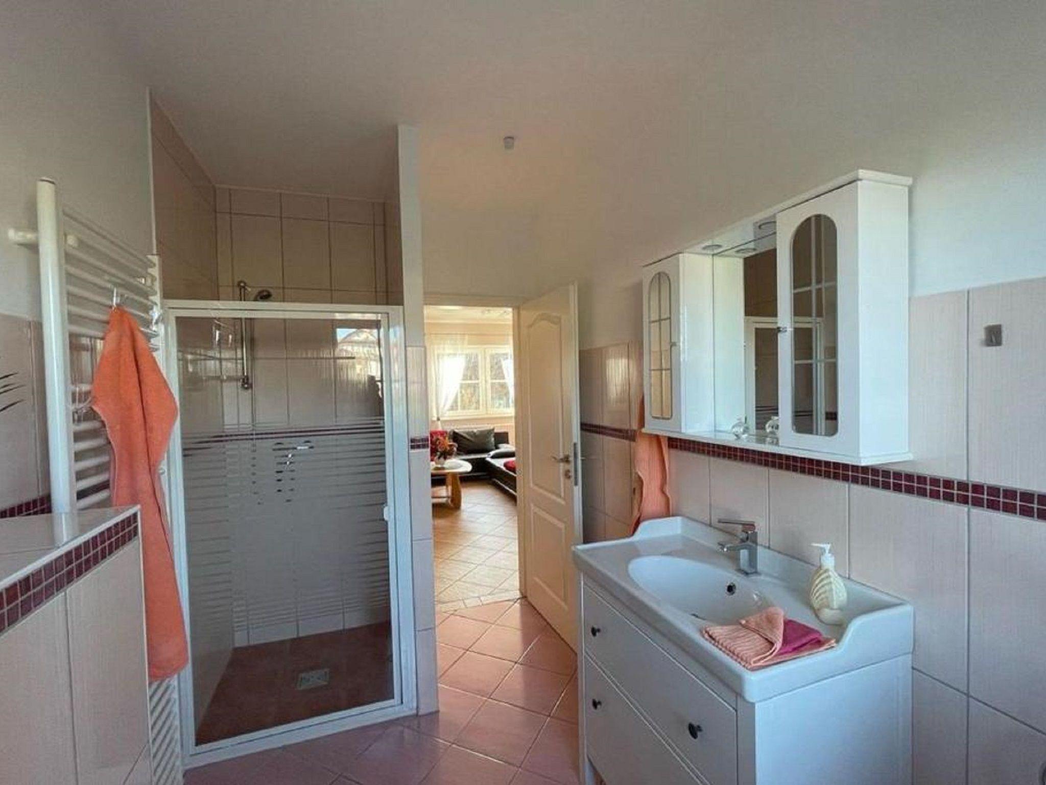 Das Duschbad besitzt eine Fußbodenheizung und neben der Toilette einen Waschtisch mit beleuchtetem Spiegel, Kosmetikspiegel und Föhn.