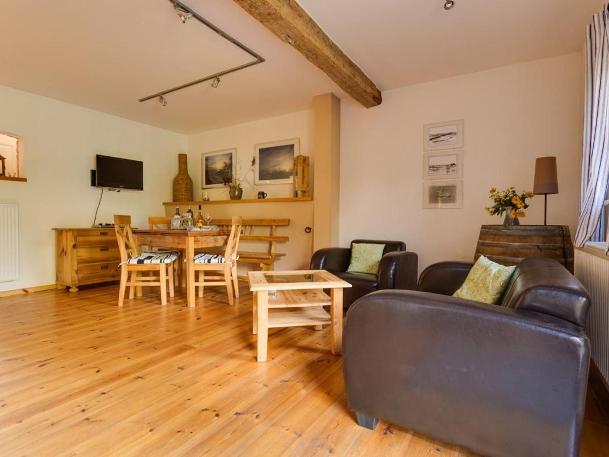 Die Wohnung Achterland im Untergeschoss ist ca. 55 m² groß und verfügt über viel Platz zum Wohlfühlen und Entspannen. Teile der Innenwände, die nach der Sanierung nicht mehr verputzt wurden, lassen Rückschlüsse auf das Alter des Gebäudes zu und vermitteln den charakteristischen Charme des Hauses. Das Wohnzimmer mit direktem Zugang zum Innenhof hat eine gemütliche Essecke, Wohnsitzecke und einen Kamin.