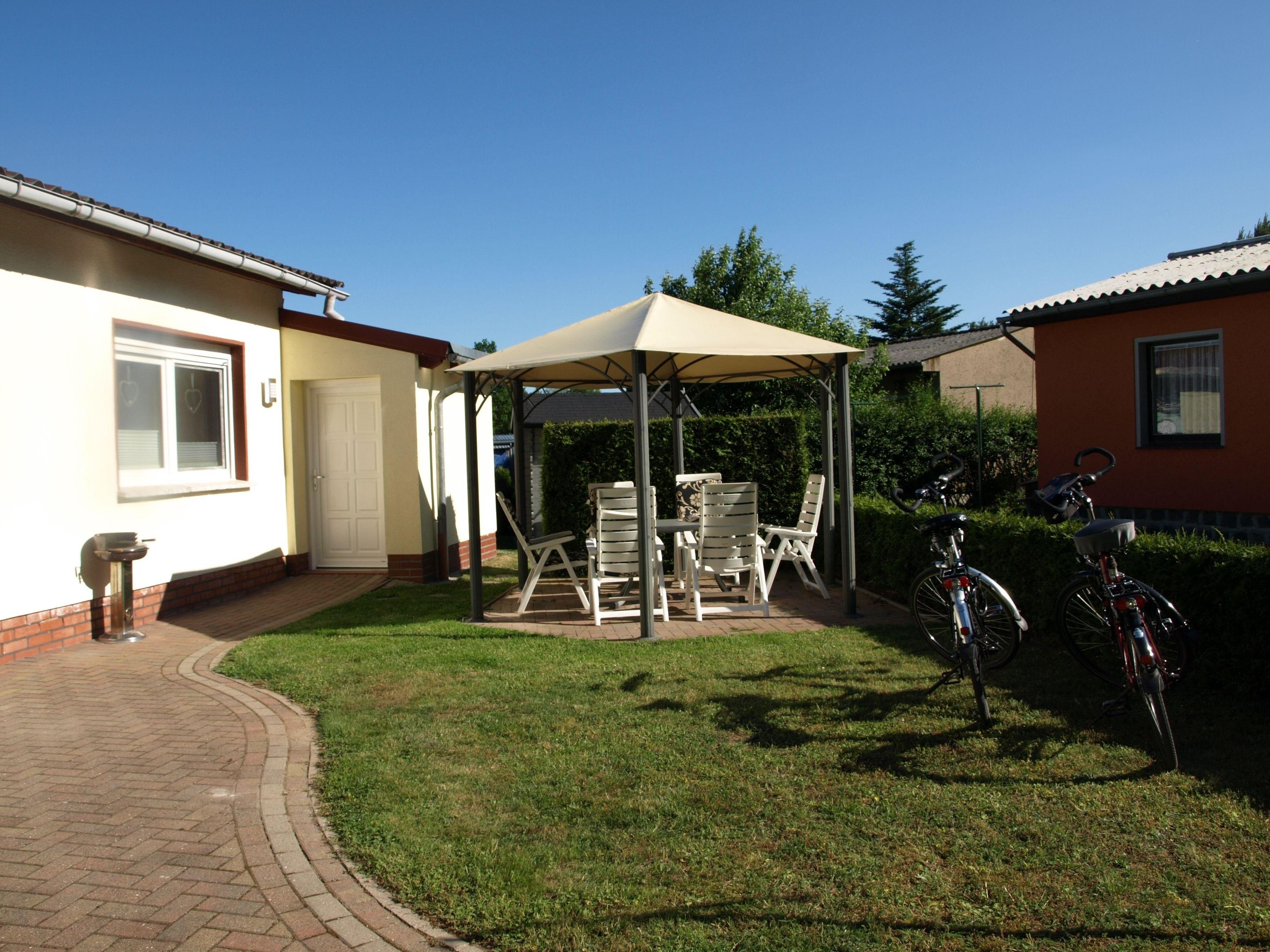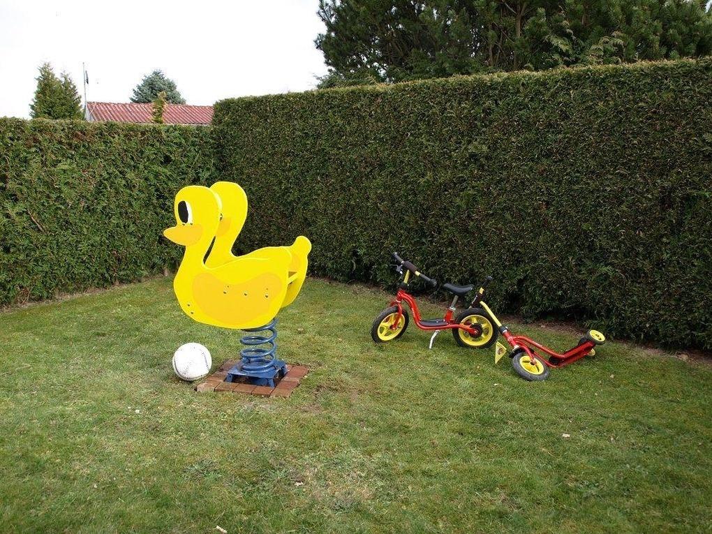 Das Haus steht auf einem komplett mit einer Grünhecke eingefriedetem Grundstück. Am Eingang befindet sich ein Gartentor. Von hier gelangen Sie über die große Terrasse zum Eingang des Ferienhauses. Es stehen insgesamt 2 Terrassen mit ausreichend Gartenmöbel, Sonnenliegen und Grill zur Verfügung. Für Schatten sorgt ein Pavillon im Garten.