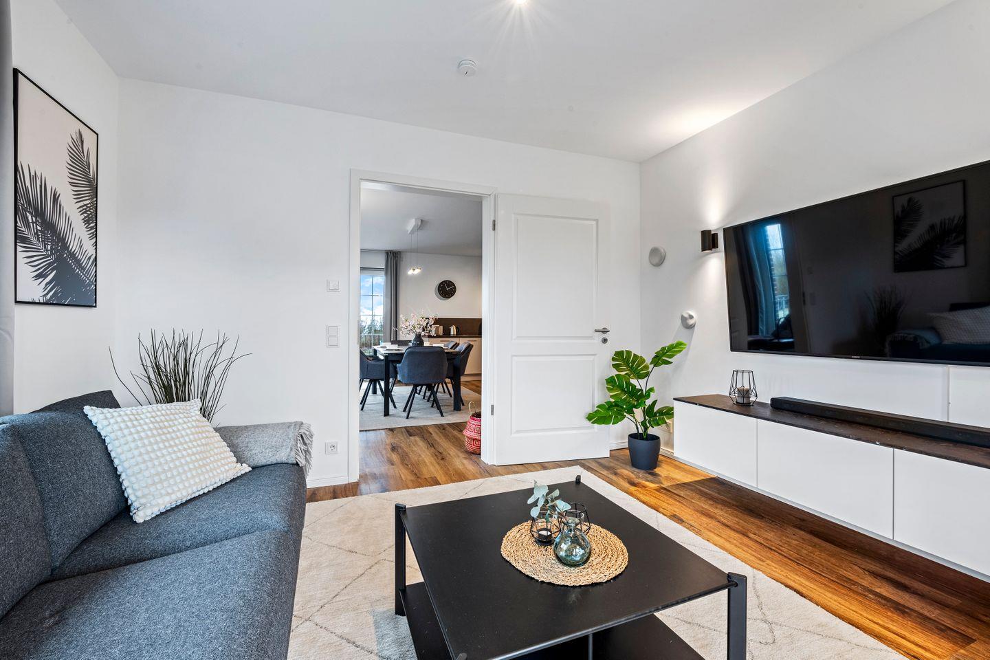 - großzügiger Wohn-Essbereich mit Sofa, TV und Zugang zum Balkon