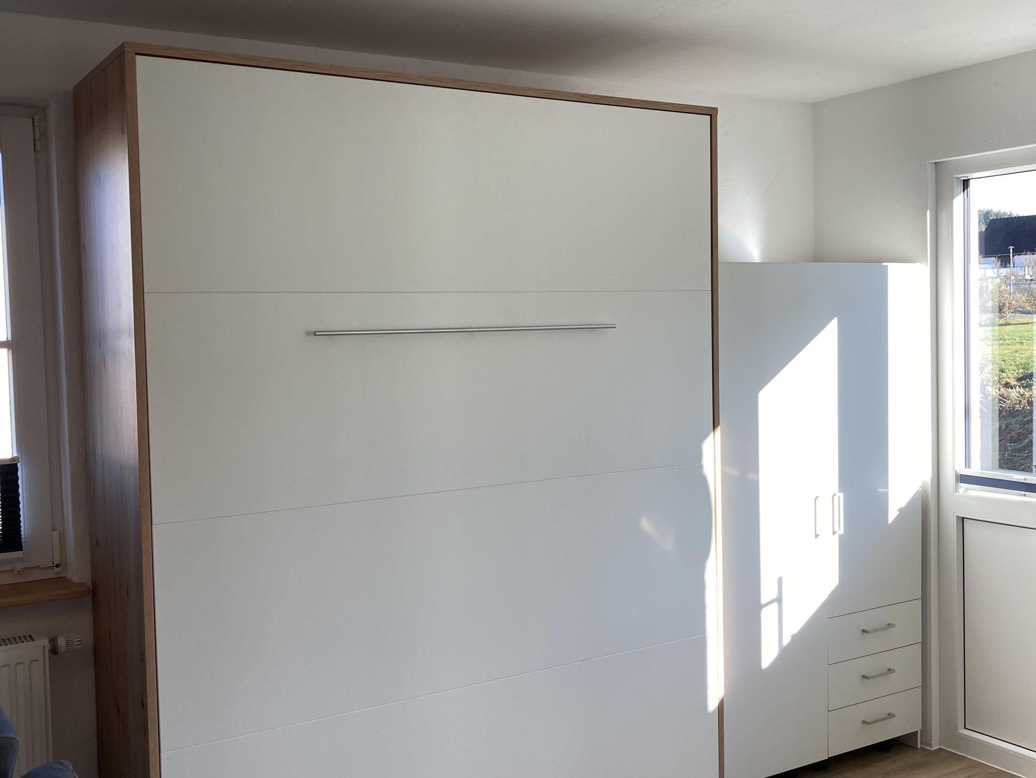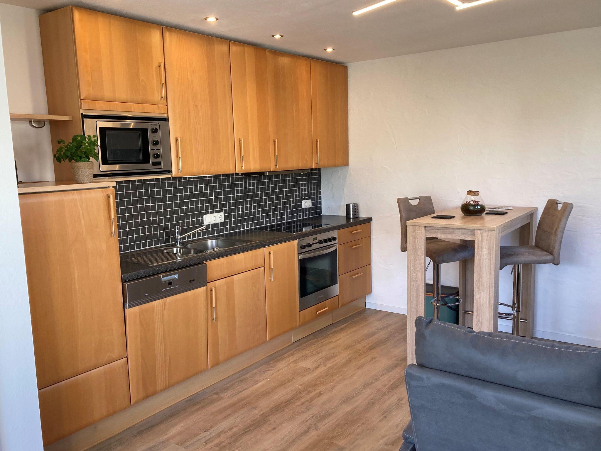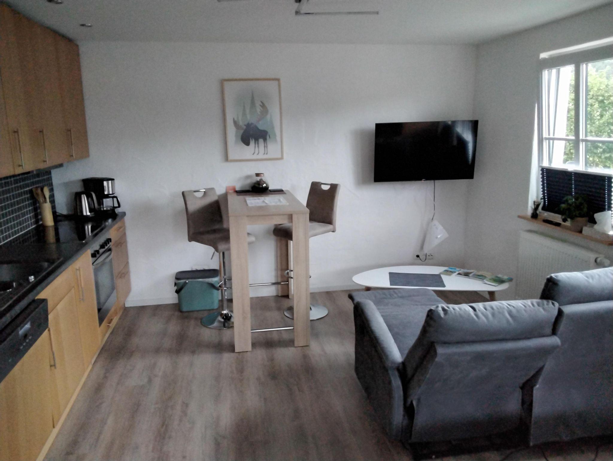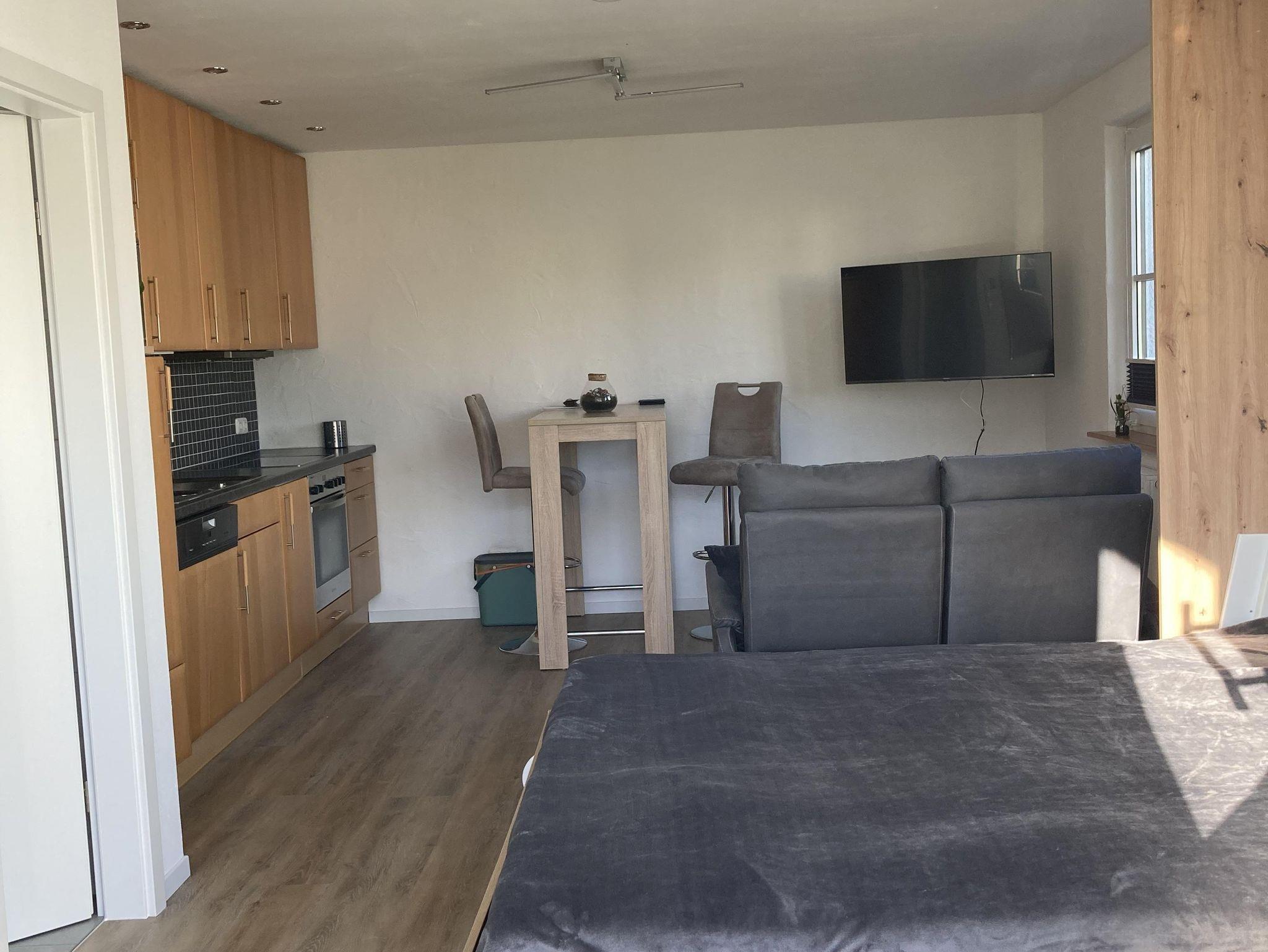 Neues, helles, 28 qm großes Apartment inklusive separatem Bad mit Dusche. Eigener, ebenerdiger Eingang, voll eingerichtete Küchenzeile, Thekentisch mit zwei höhenverstellbaren Hockern, Flachbild-TV, Funktionscouch, gratis WLAN, neues, hochwertiges Schrankbett (160x200) mit Leseleuchten und USB. Ruhige Lage, Sitzmöglichkeiten draußen, Grillstelle mit offenem Feuer, abschließbare Fahrradstellplätze, Unterstellmöglichkeiten für Motorräder, Pkw-Parkplatz mit Wallbox.
