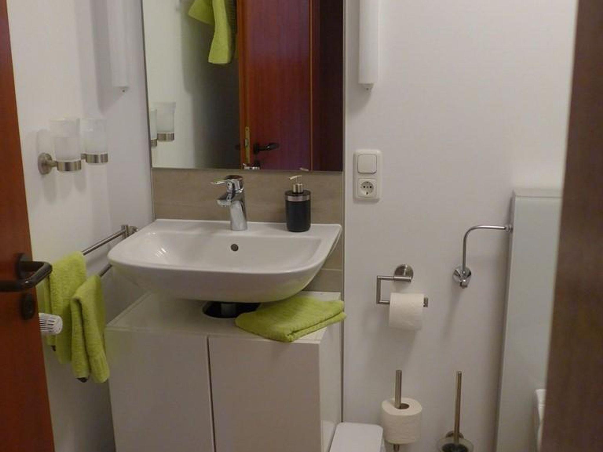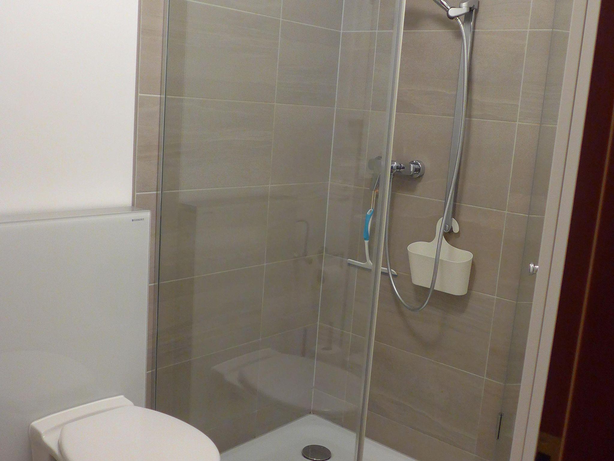 Im Bad befindet sich eine flache Duschtassse mit feststehender Duschkabine, WC, Kosmetikspiegel, Föhn, Schrank mit ausreichender Ablagefläche,usw.