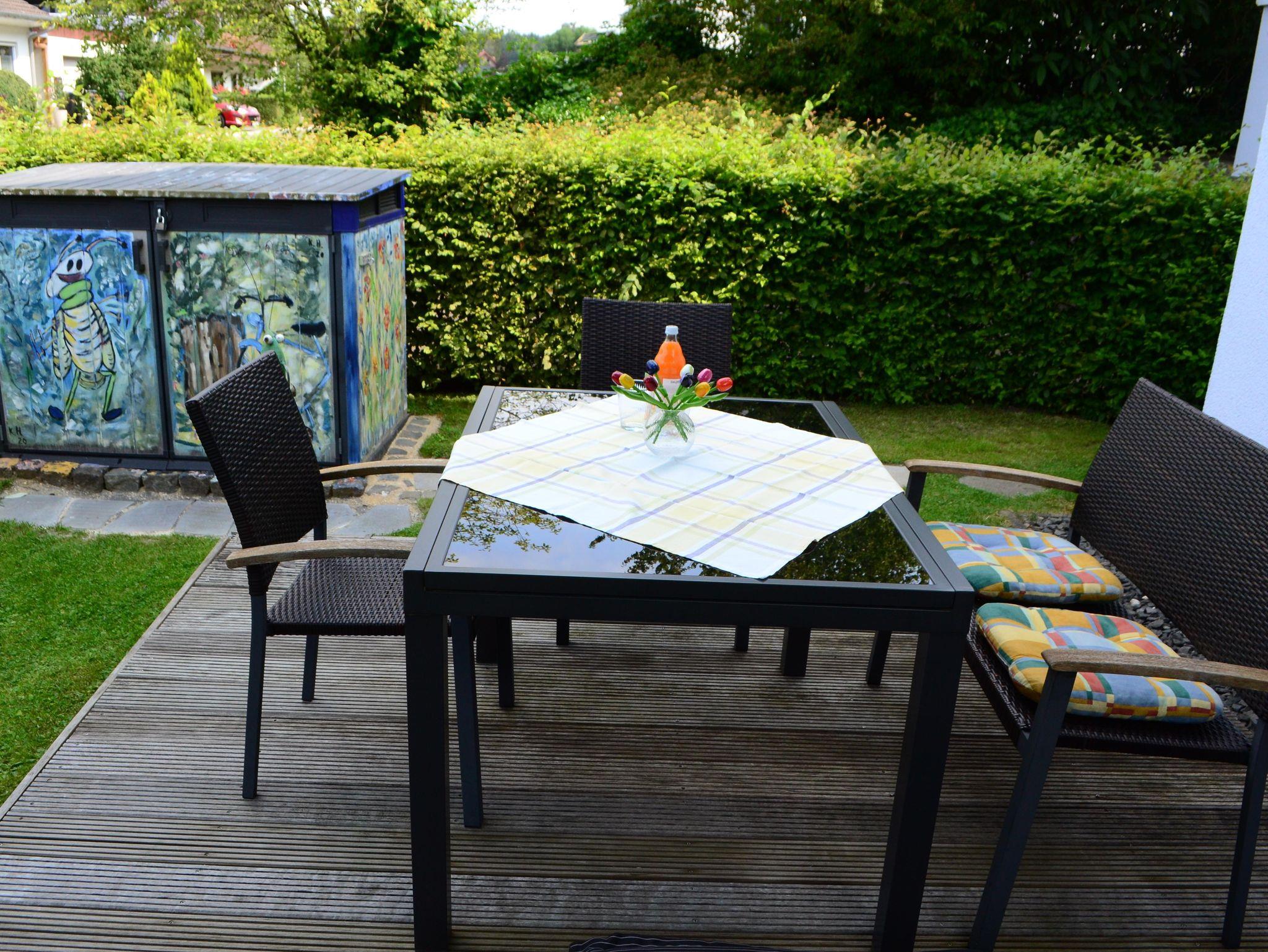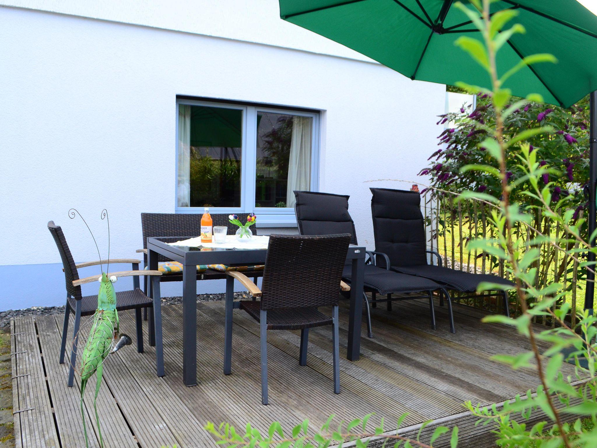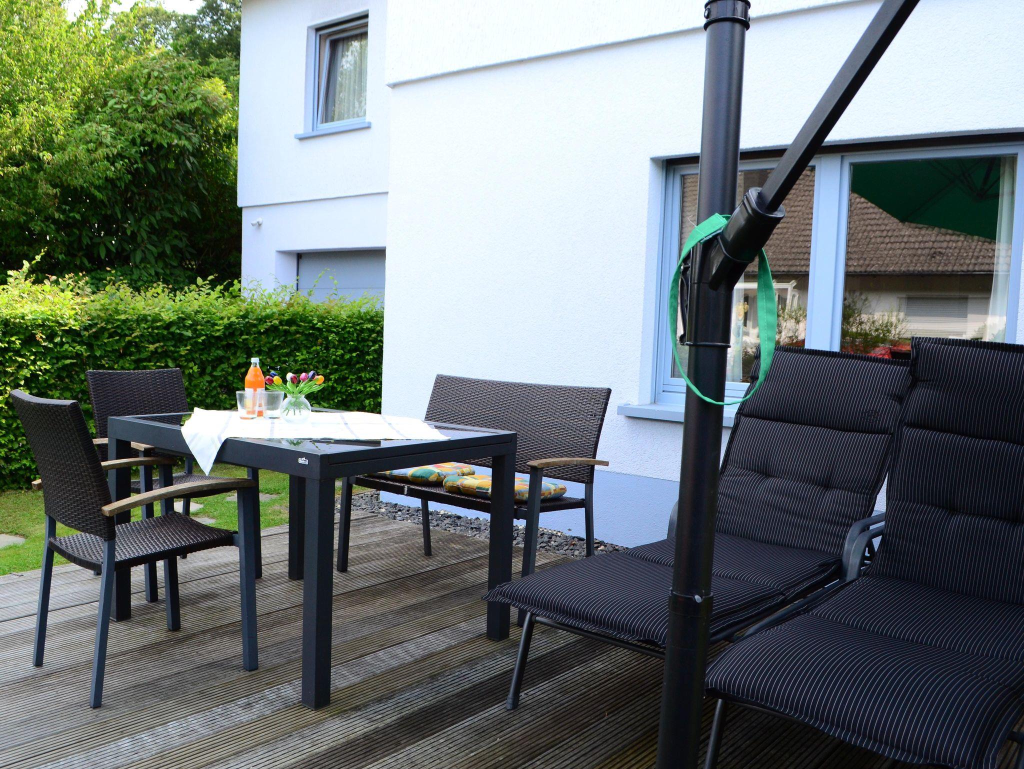 Sehr ruhig gelegene Ferienwohnung am Waldrand, nur Anliegerverkehr. Neu und hell eingerichtet mit separatem Eingang. Gemütliche Leseecke im Wohnbereich inkl. Bibliothek, Hörbücher,Flachbildfernseher, DAB/Bluetooth/CD-Anlage, usw. Eigene Terrasse mit Gartenmöbeln, Liegestühlen mit Auflagen, großer Sonnenschirm. Komplett eingerichtete Einbauküche mit Ceranfeld, Backofen, Kühl- und Gefrierfach, Geschirrspüler, Mikrowelle, Kaffeemaschine, usw.