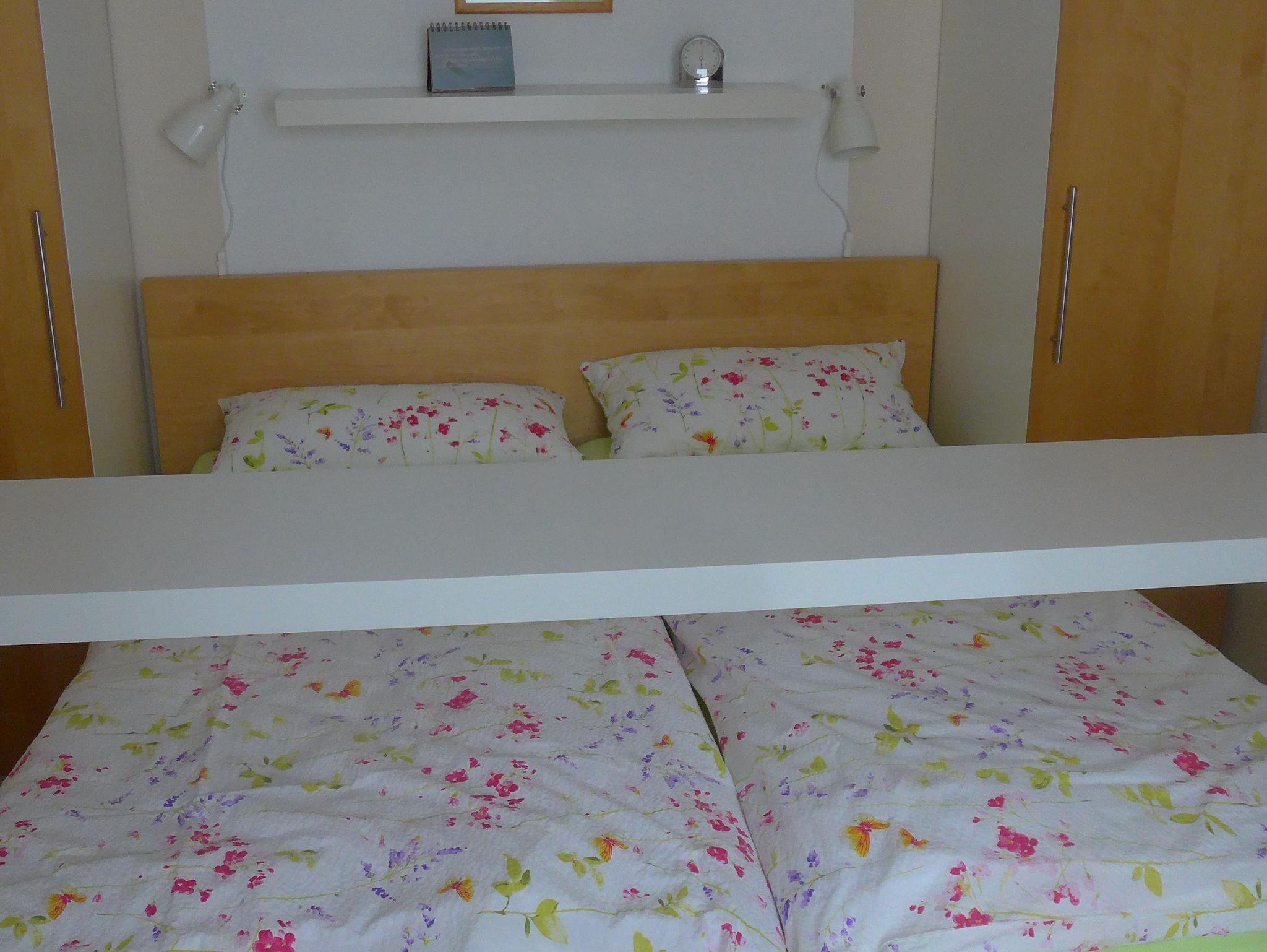 Das Schlafzimmer bietet ein Doppelbett mit getrennten Matratzen und Allergikerbettwäsche. Große fahrbare Ablage über den Betten.