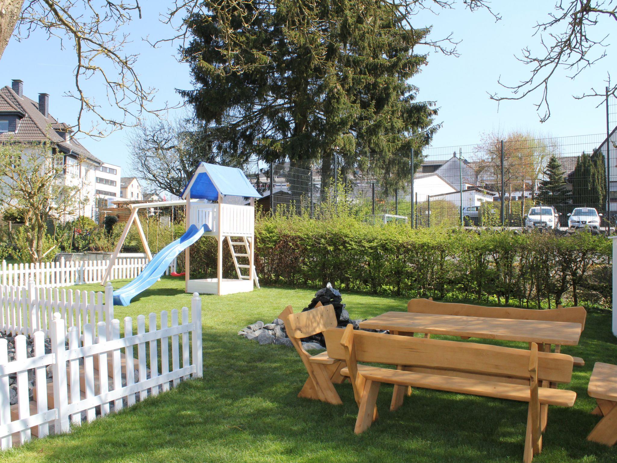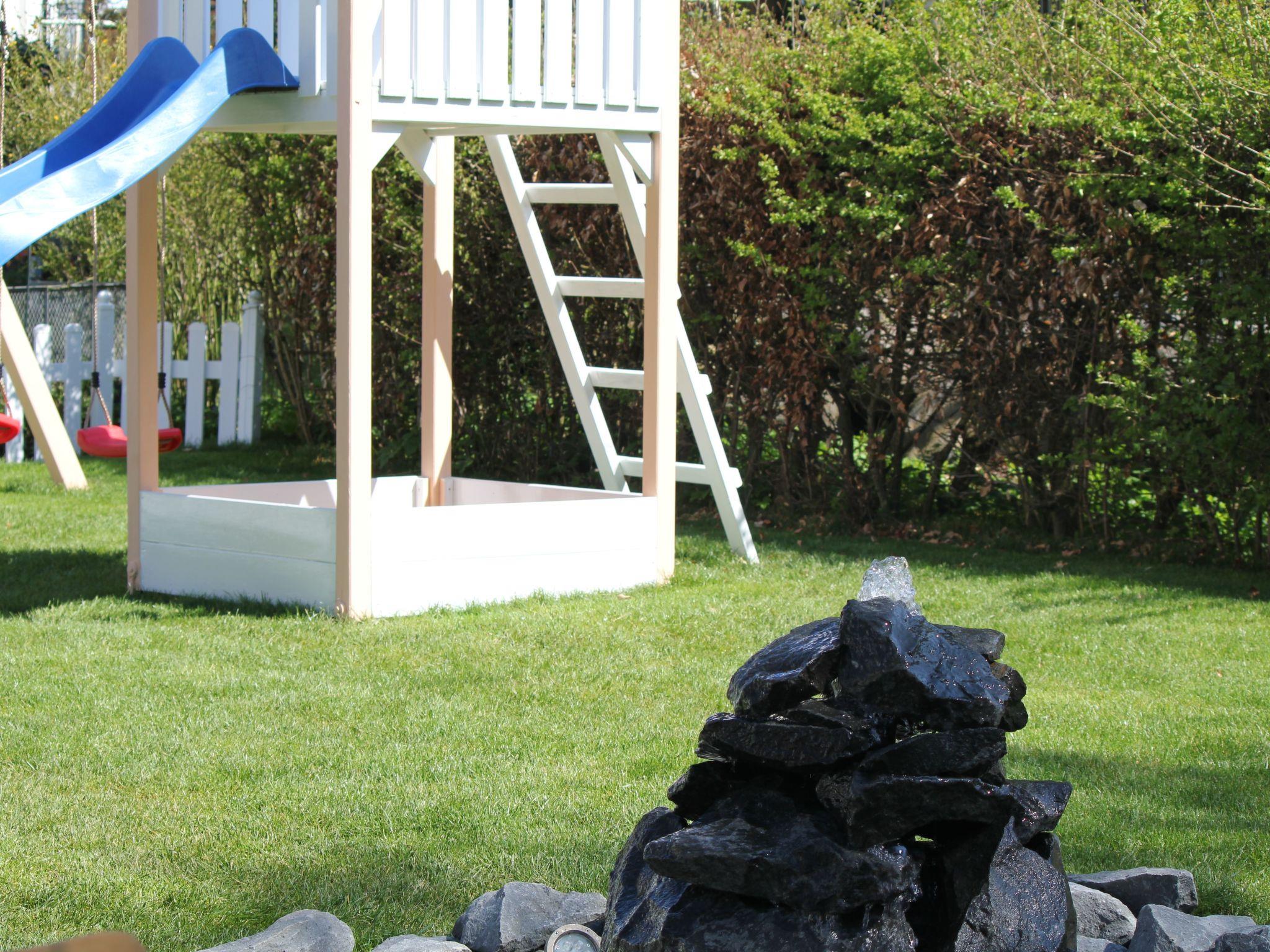 A quiet garden area with lawn, seating area, 2nd barbecue, fountain and a children's play tower (2 swings, slide, sandpit) is also located behind the house and can also be used.