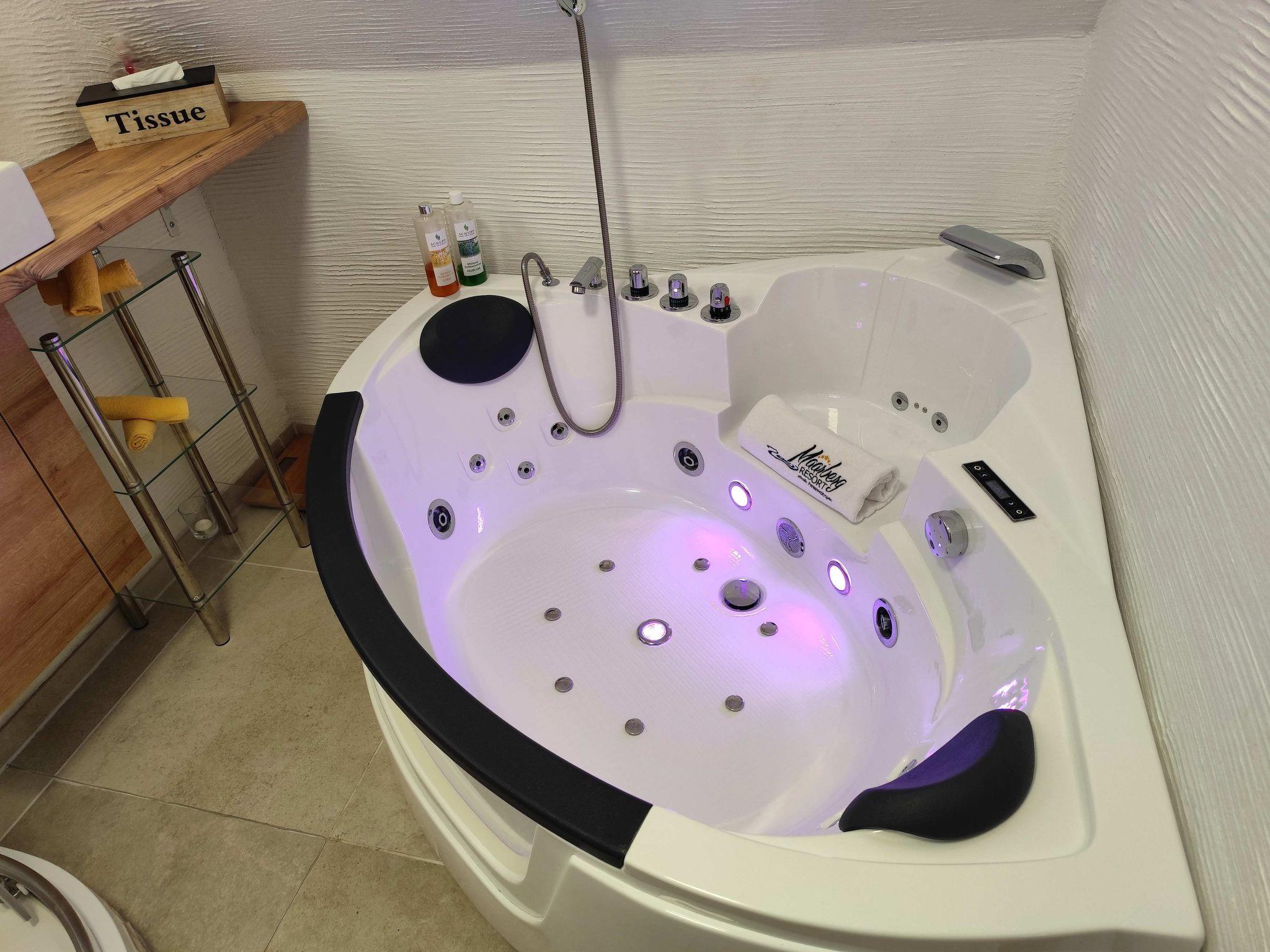 3 bathrooms: 1 x bath and shower, 1 x whirlpool and shower, 2 x WC (1 x on the upper floor and 1 x on the lower floor) and an additional shower with washing facilities (on the lower floor).