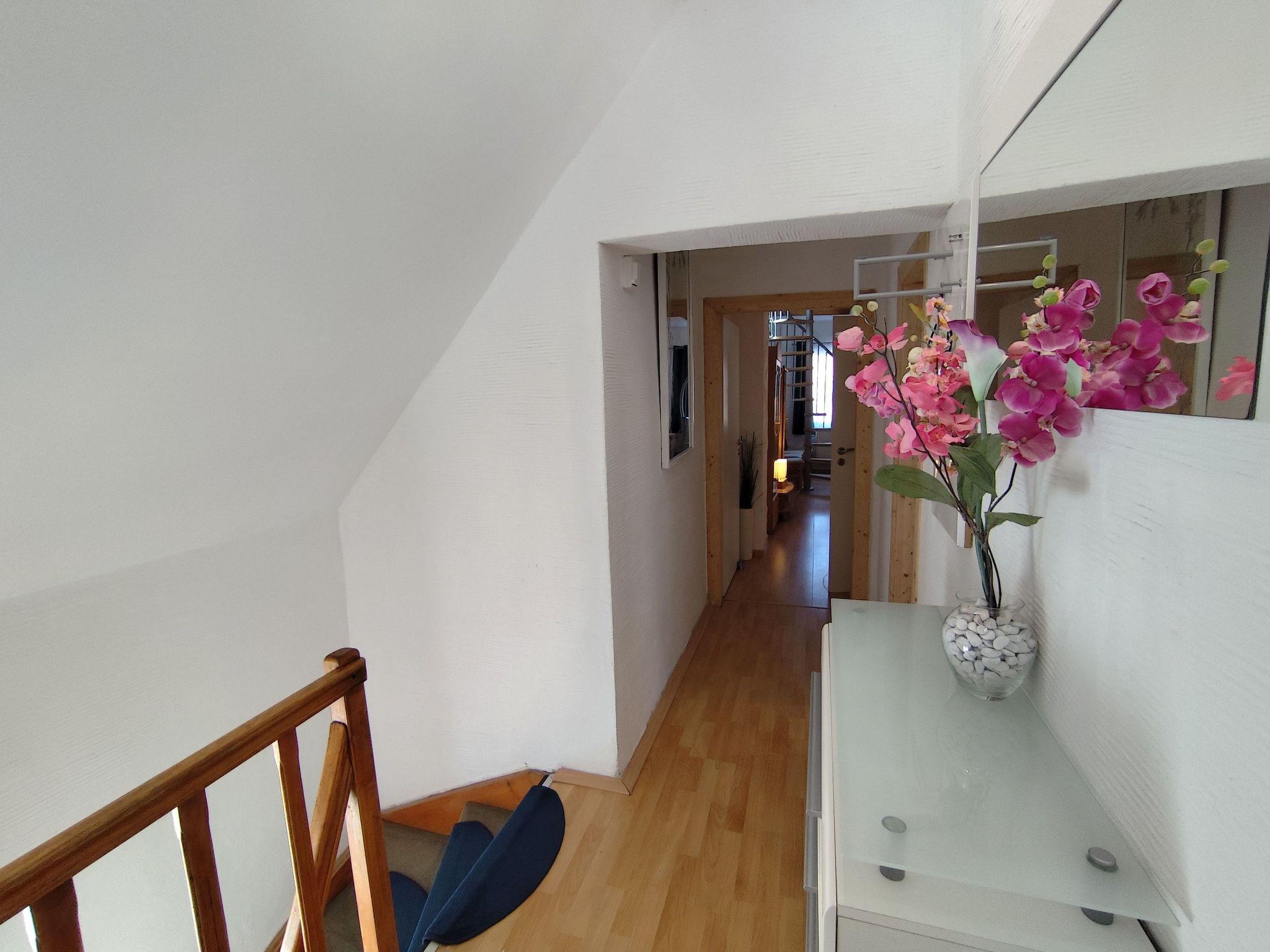 The beautiful, new sauna with 3D floor is integrated in the gallery. The flat also has a new, separate kitchen with 4-burner hob (ceramic hob) and oven, dishwasher, fridge with freezer compartment and an additional dining area in the kitchen, bathroom / shower / WC / whirlpool, modern countertop washbasin, beautiful LED mirror, hotel hairdryer, infrared heating with photo, HD TV and DVD, beautiful wooden floorboard, wardrobe, central heating, games. A washing machine and tumble dryer are located in the basement of the house.