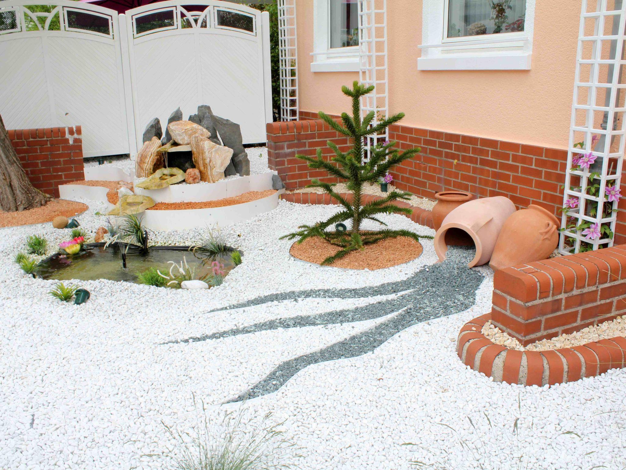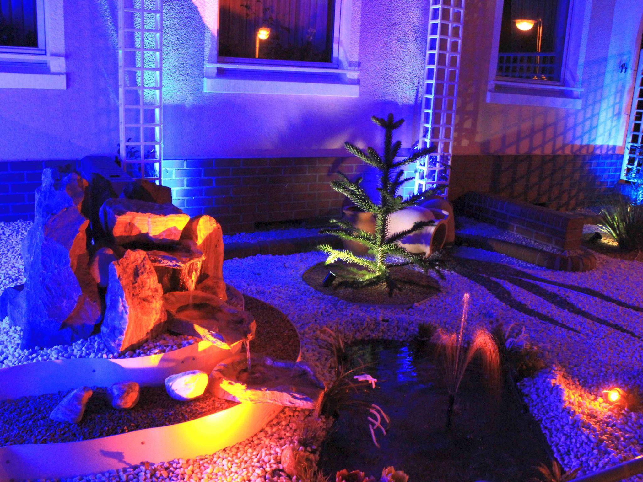An ornamental gravel area has been lovingly and lavishly laid out on the outside of the house. With a fountain and a small waterfall. The house and the outdoor areas are very attractively illuminated in the evening and at night in a play of colours with LED spotlights.